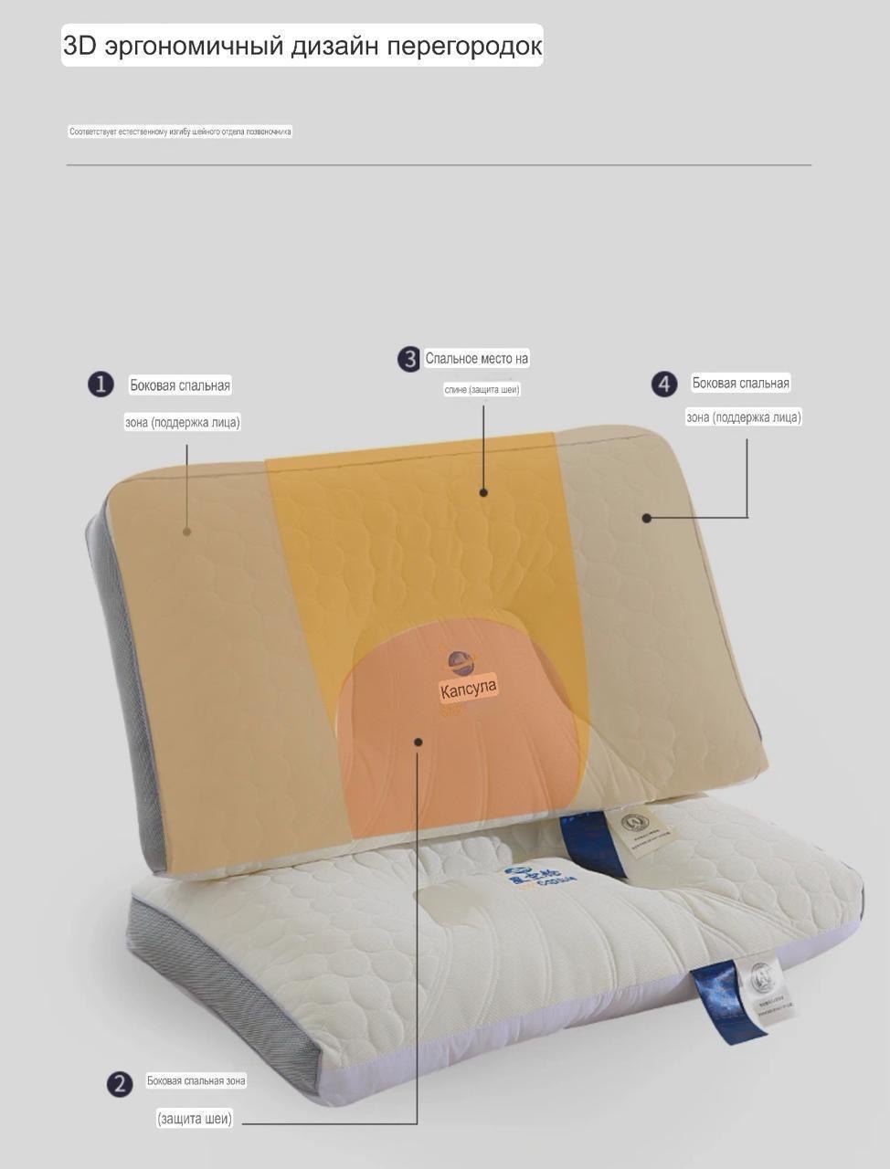 Анатомическая подушка нового поколения, вдохновленная комфортом салонов первого класса, создана для тех, кто стремится к безупречному качеству сна и полноценному восстановлению организма. Главной инновацией модели является сложный 3D-дизайн с системой функциональных перегородок, которые разделяют поверхность на несколько специализированных зон. Центральная часть в форме мягкой капсулы идеально фиксирует голову в естественном положении, в то время как выделенные боковые сегменты обеспечивают деликатную поддержку лица и шеи при переворотах. Такая архитектура учитывает естественные изгибы позвоночника, позволяя мышцам полностью расслабиться и минимизируя риск возникновения утренних болей или заломов на коже.