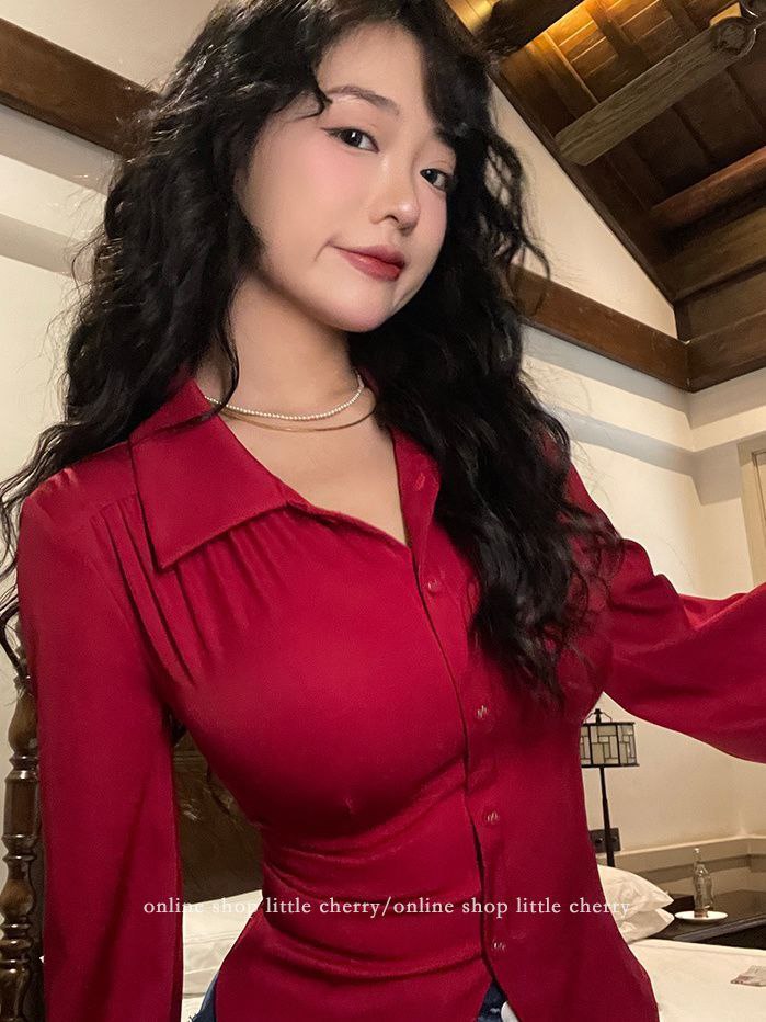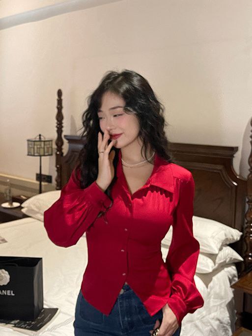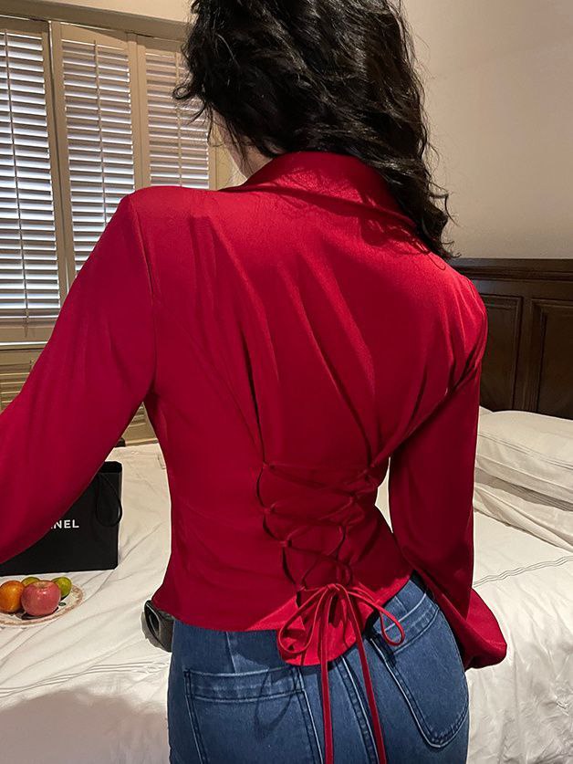 Атласная рубашка насыщенного красного цвета с длинным рукавом и классическим воротником. Особенность модели — дизайн спинки: рубашка оформлена шнуровкой, которая завязывается в узел, подчёркивая талию и добавляя образу пикантности. Приталенный крой акцентирует силуэт, а гладкая ткань с лёгким блеском придаёт изделию нарядный вид.