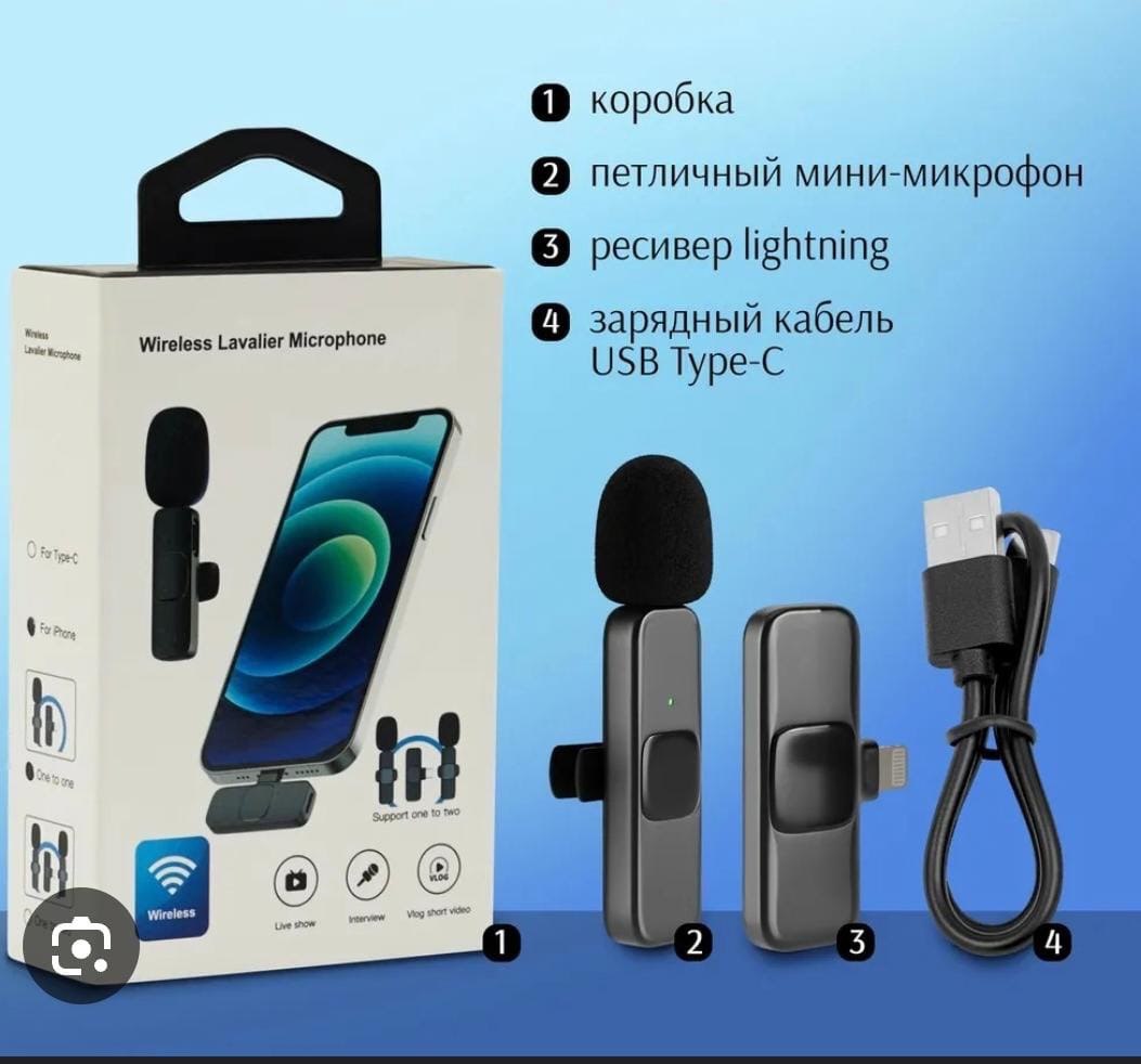 Особенности: Система состоит из миниатюрного передатчика, который крепится к одежде, и приемника, подключаемого к устройству записи, например, смартфону. 1 микрофоном , оптом:450✅, 2 микрофоном.