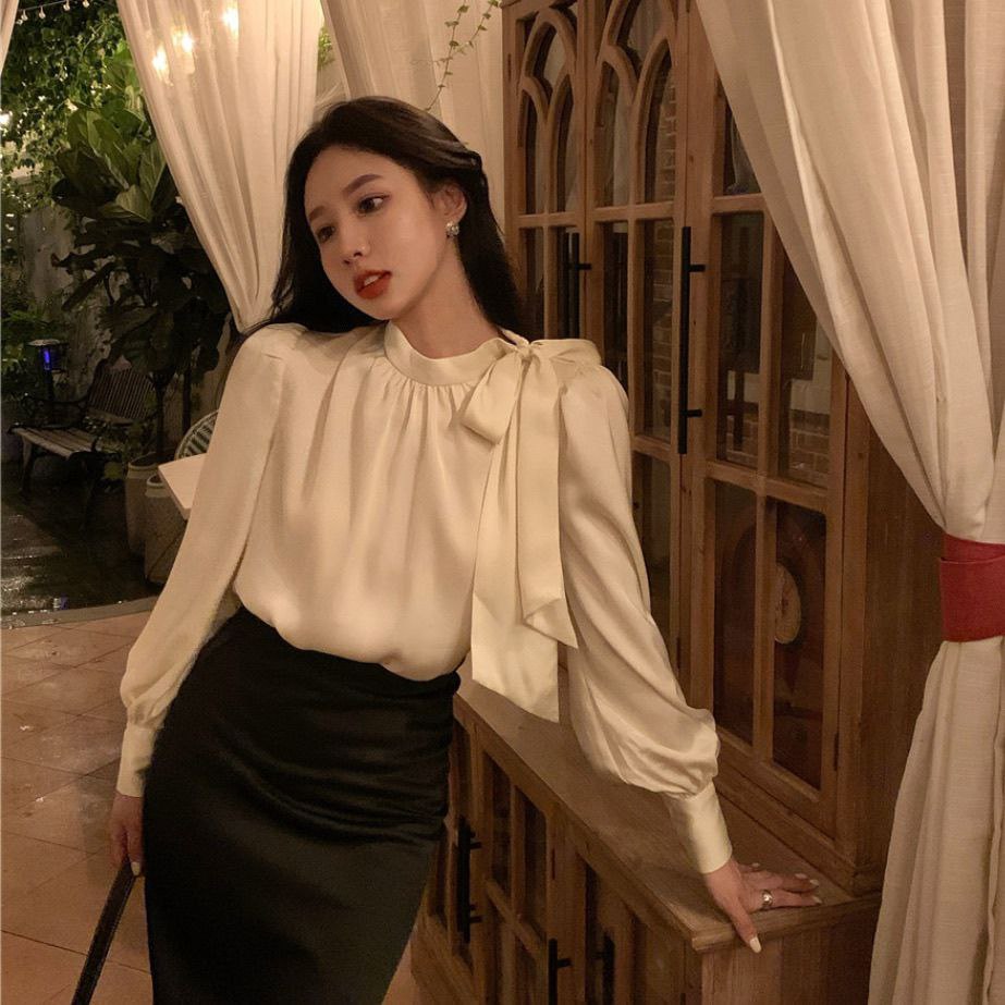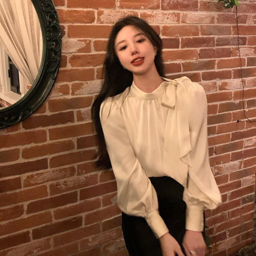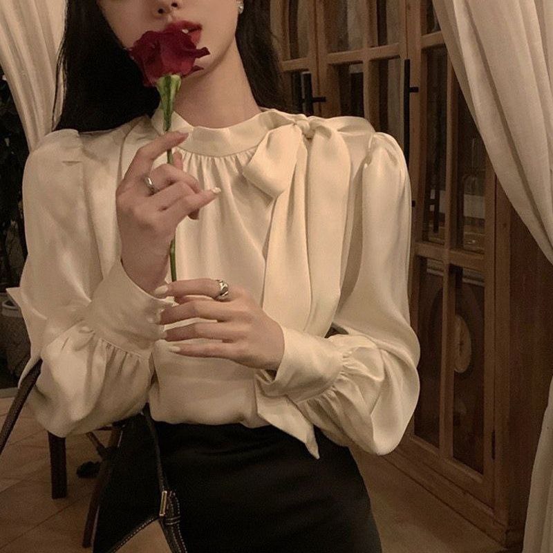 Элегантная женская блузка светлого кремового оттенка с длинными рукавами-фонариками. Воротник оформлен в виде аккуратного банта, придающего модели изысканность. Ткань лёгкая, струящаяся. Свободный крой и объёмные рукава создают воздушный, женственный силуэт. Подходит для создания как повседневных, так и нарядных образов.