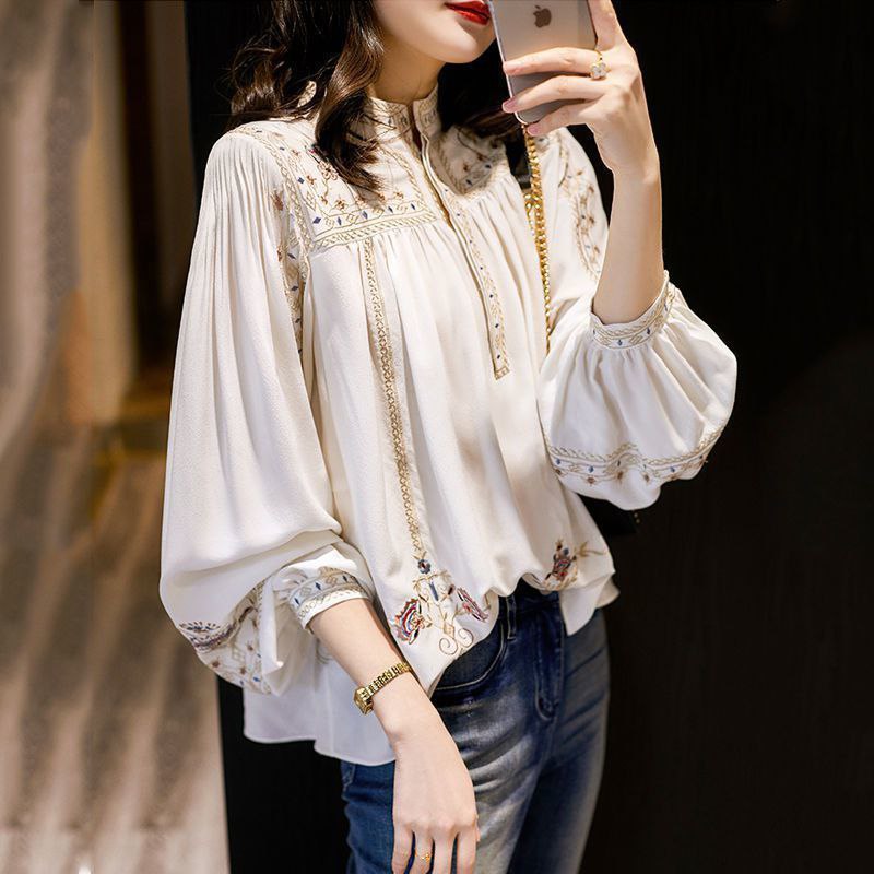 Шифоновая блузка свободного кроя с вышивкой в этническом стиле. Выполнена в светлом молочном оттенке, украшена изящной вышивкой с цветочными мотивами вдоль горловины, по краям рукавов и в нижней части изделия.