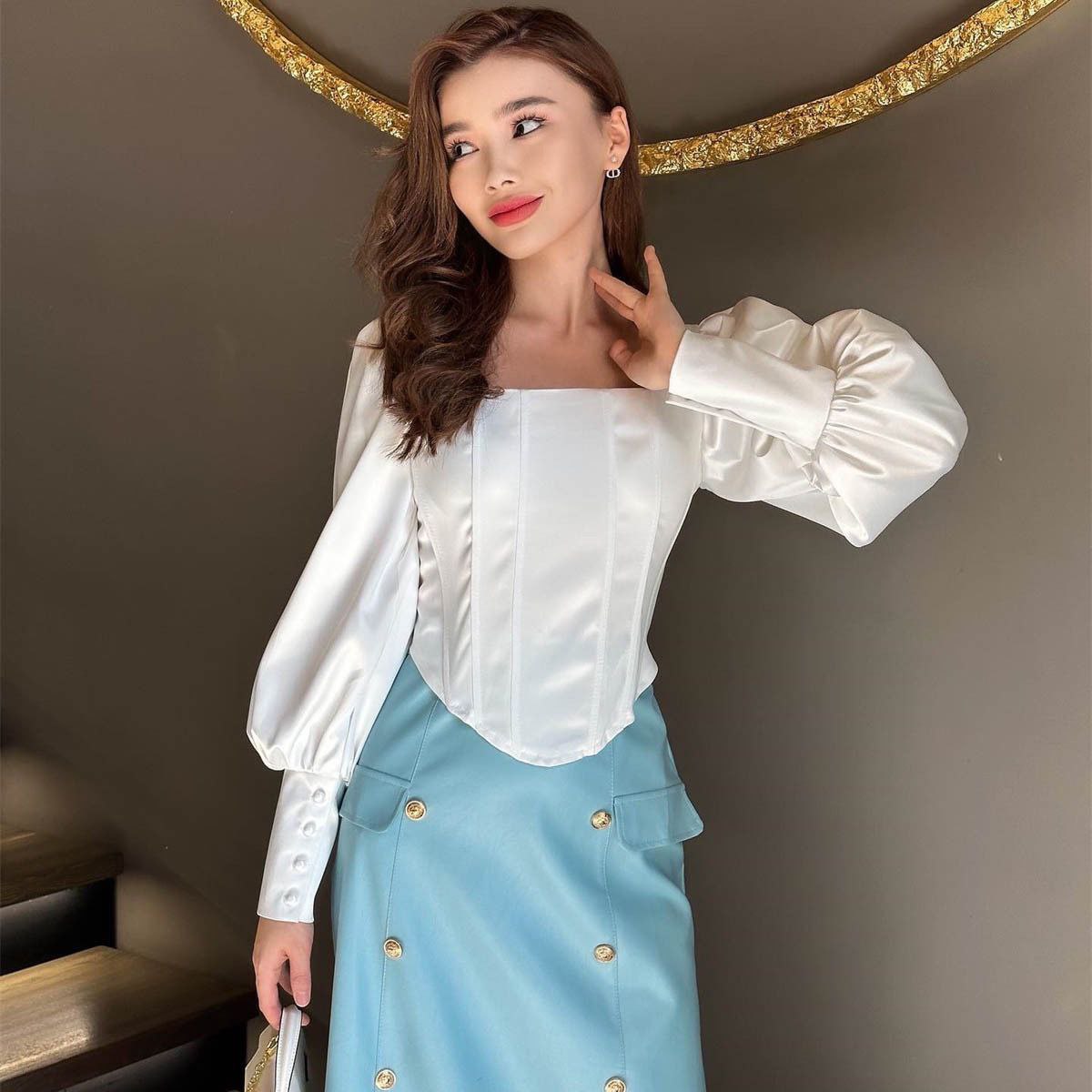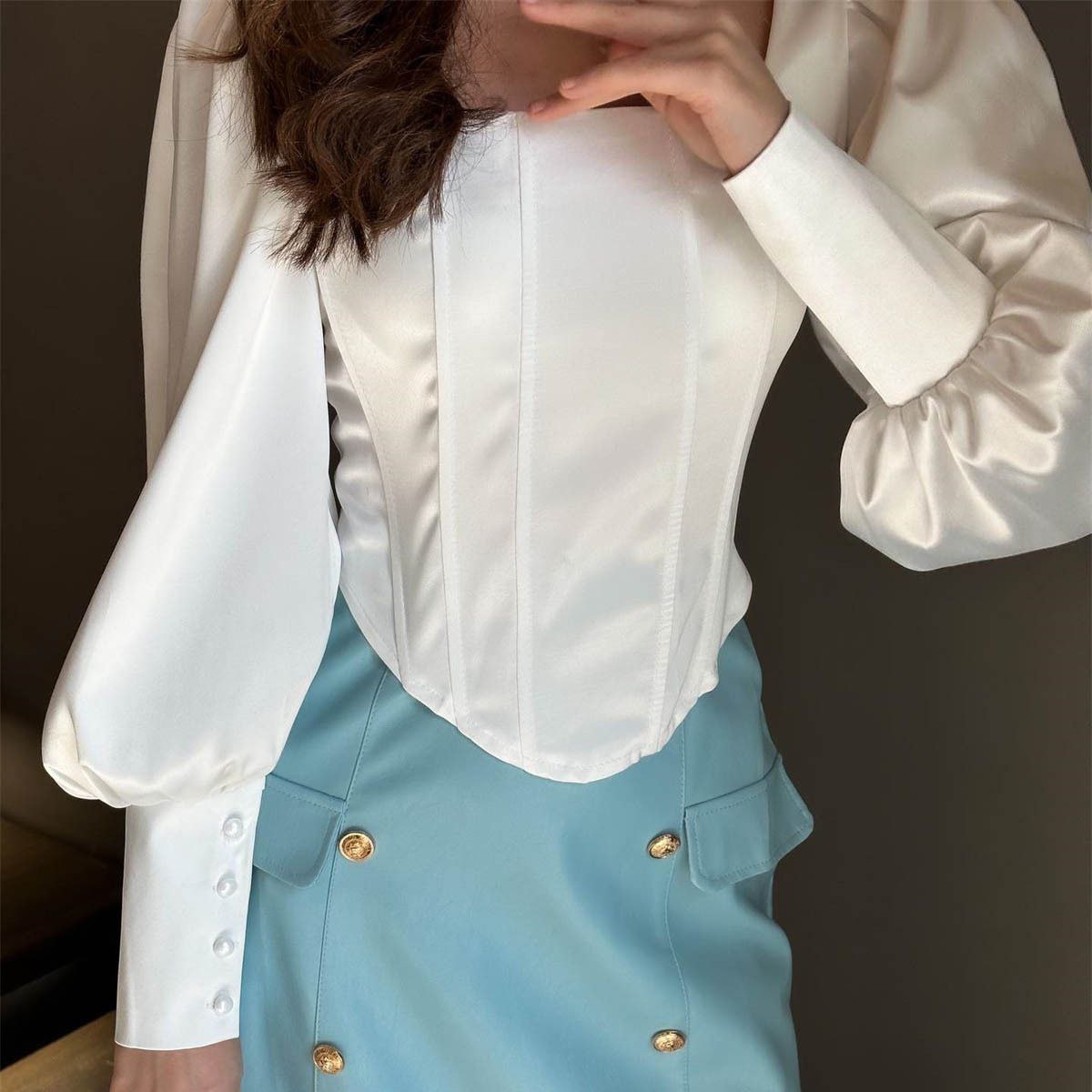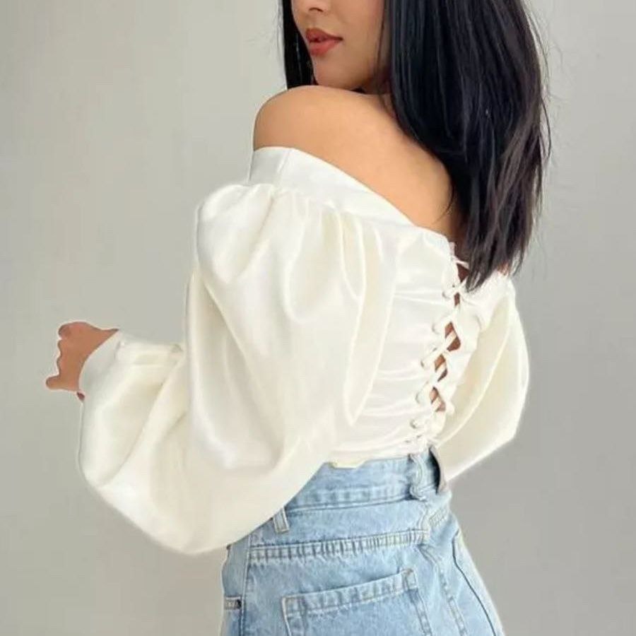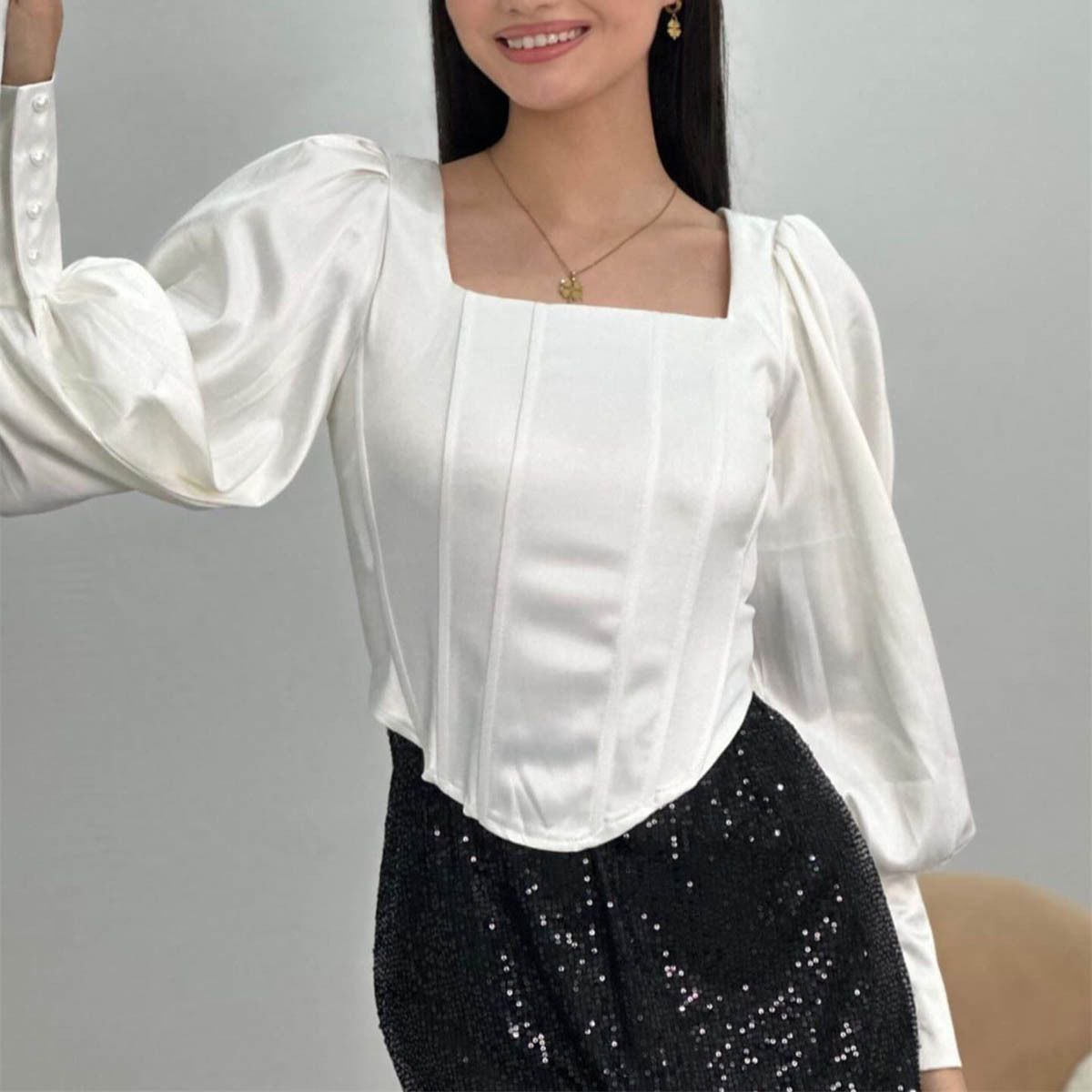 Блузка-корсет с пышными рукавами-фонариками и квадратным вырезом.