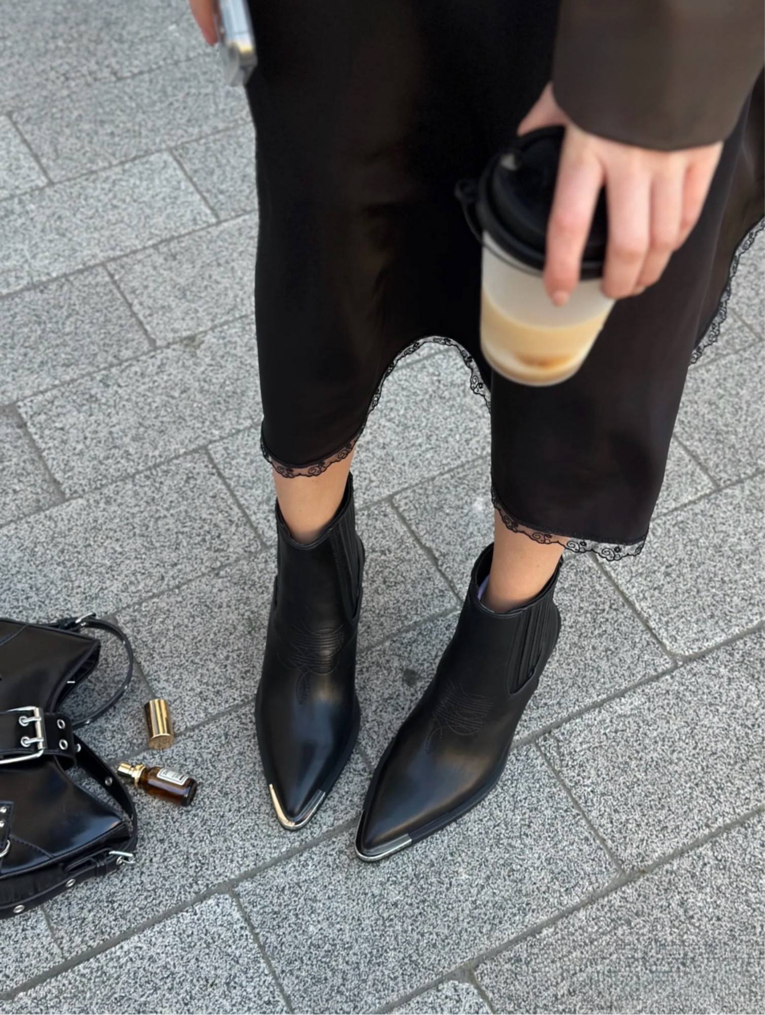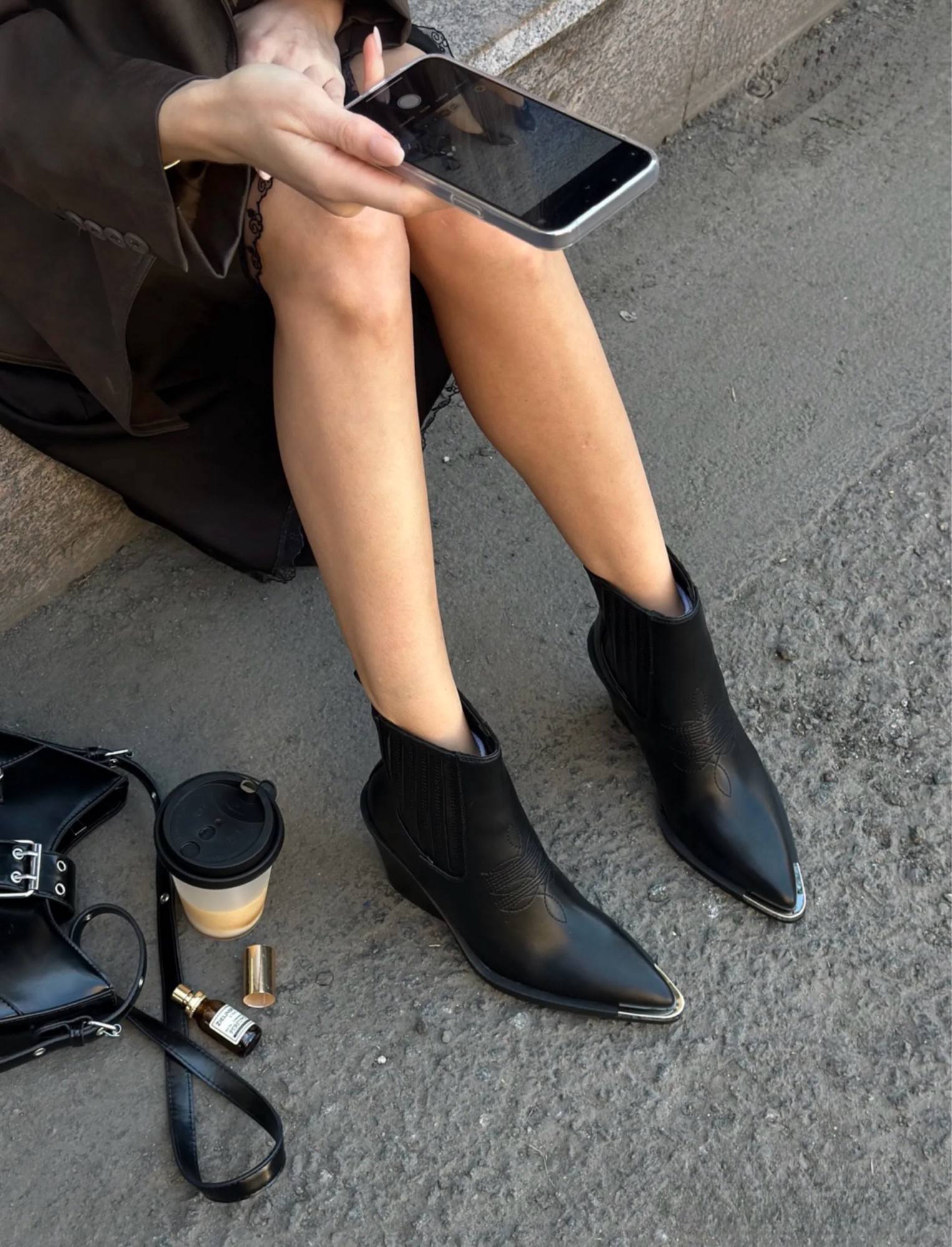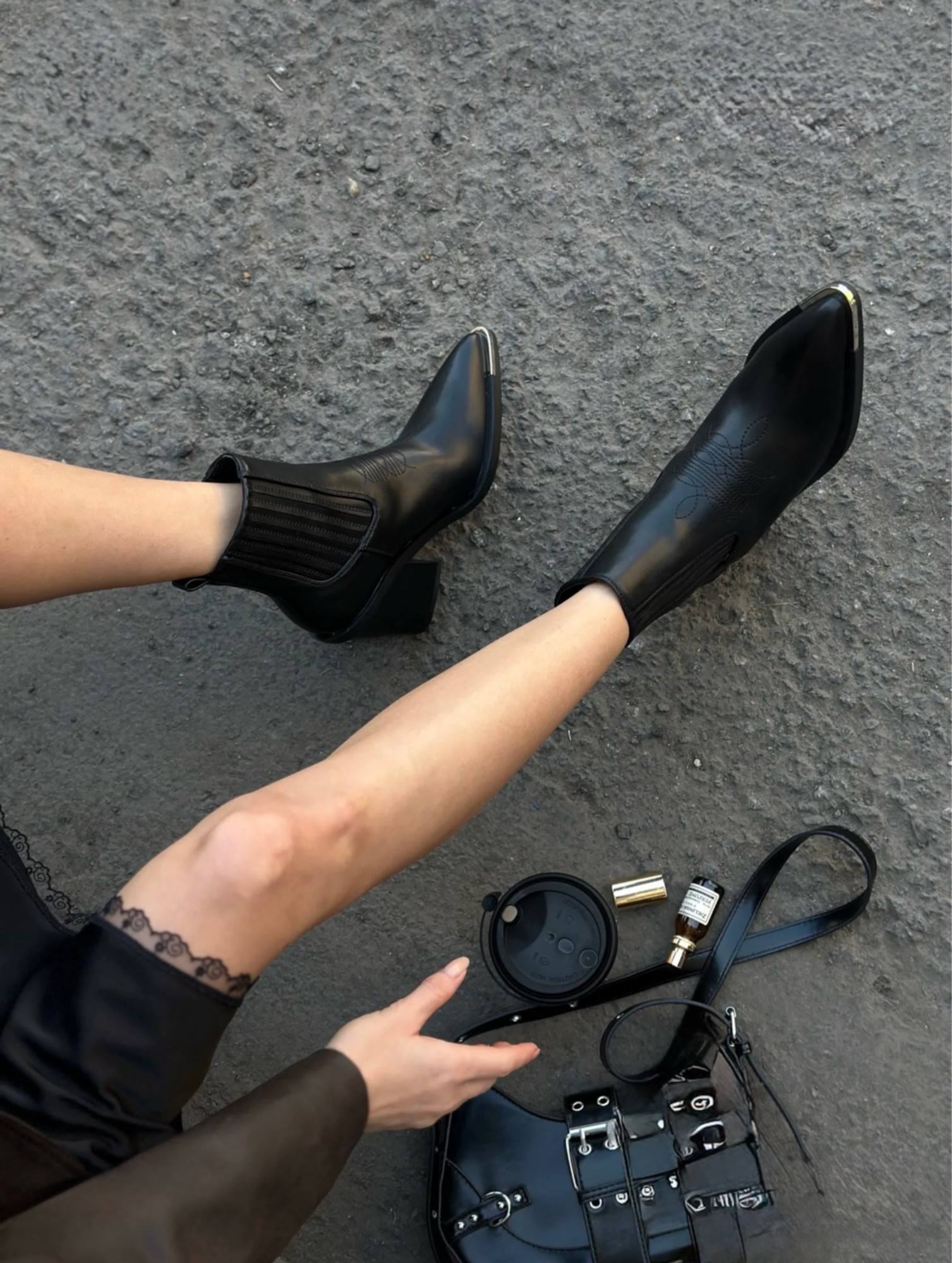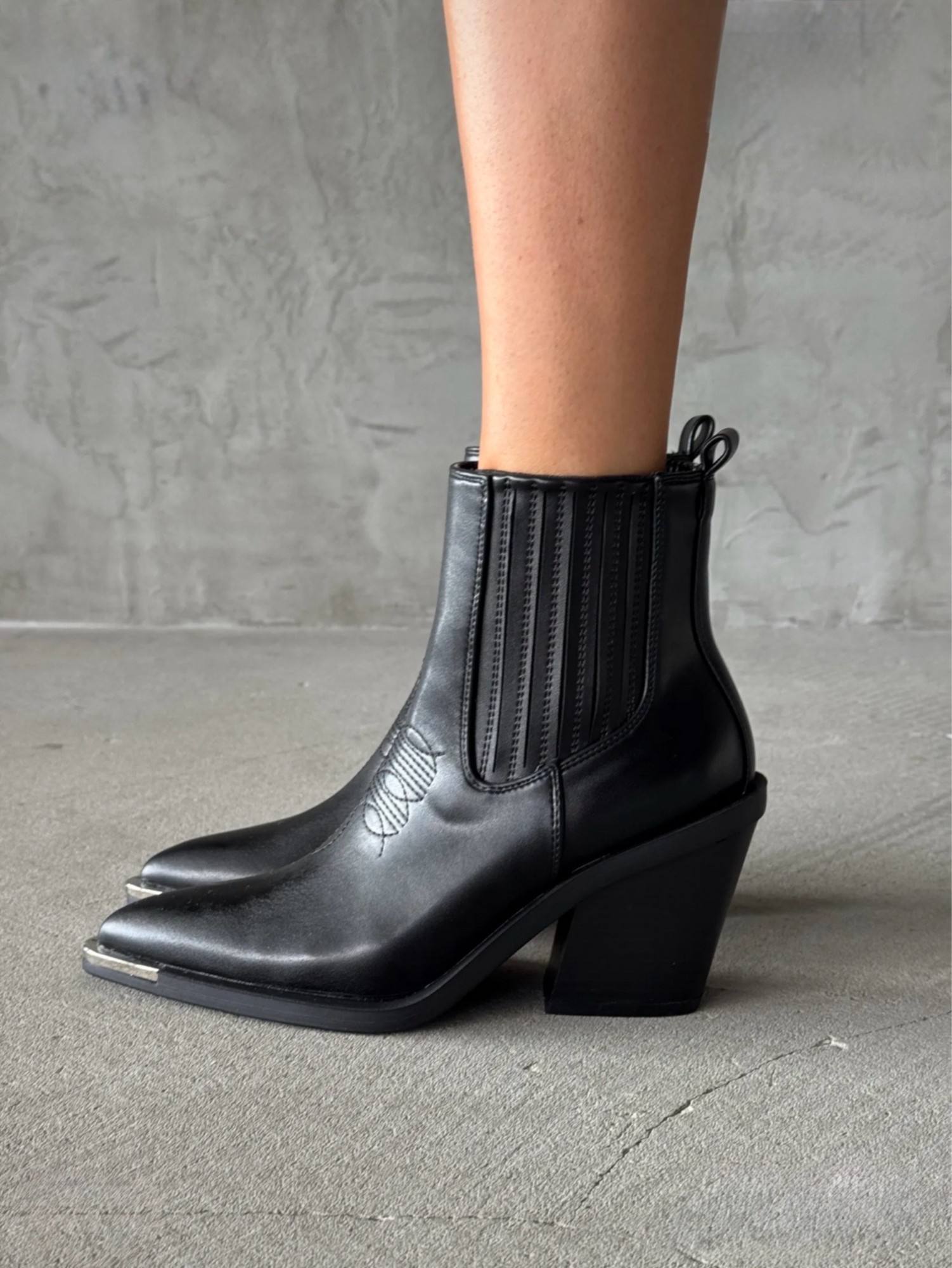Ботильоны-челси чёрного цвета с заострённым носом и металлическим наконечником. Модель дополнена эластичными боковыми резинками для удобства надевания. Каблук средней высоты (около 7 см) обеспечивает устойчивость и комфорт при ходьбе. Выполнены из гладкой чёрной кожи, сочетают в себе элегантность и практичность — подойдут как к повседневному, так и к более формальному образу.