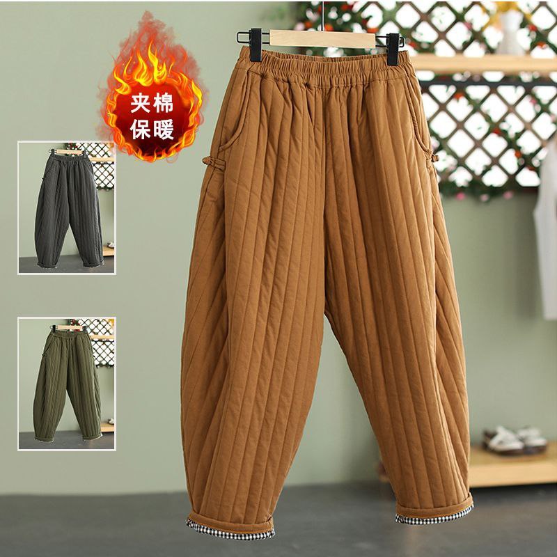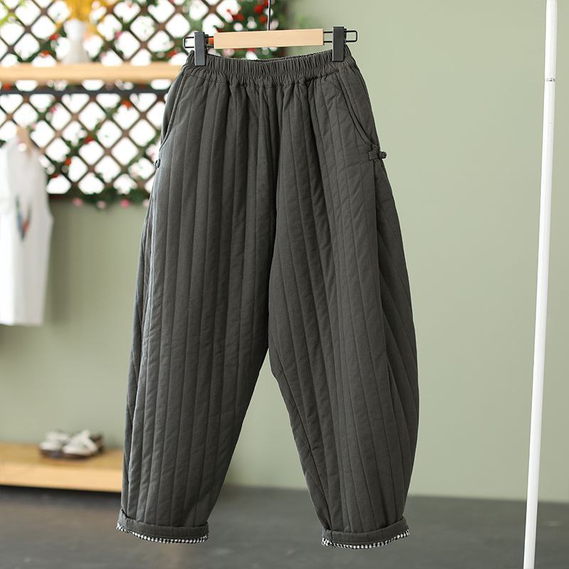 Утеплённые брюки свободного кроя с эластичным поясом. Модель выполнена в стёганой технике, отличается удобством и практичностью — не сковывает движения, хорошо сохраняет тепло. По боковым швам расположены карманы. Низ брюк украшен контрастной клетчатой отделкой.