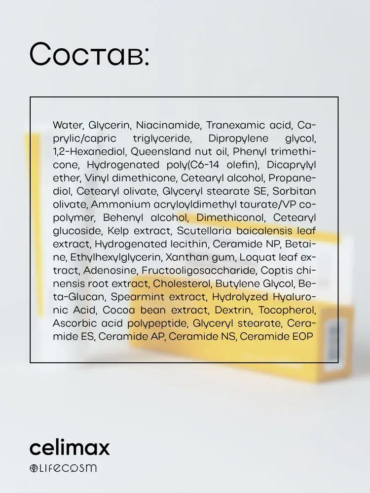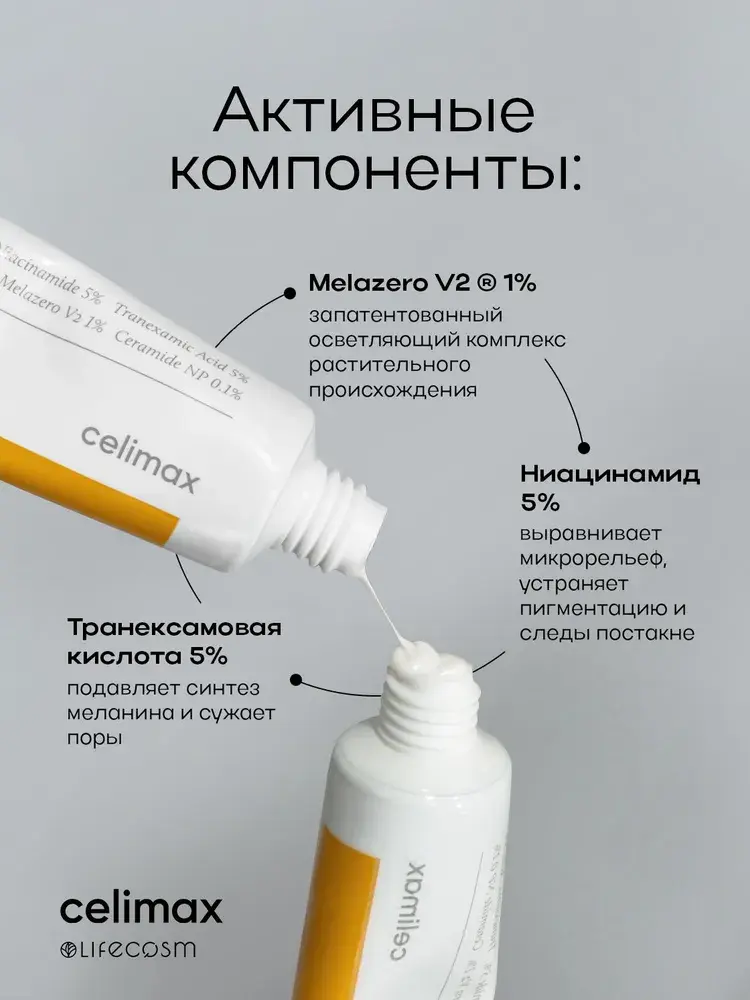 Celimax Pore and Dark Spot Brightening Cream — это осветляющий выравнивающий крем для лица, разработанный специально для борьбы с тусклостью кожи, расширенными порами, пигментными пятнами и неоднородностью тона и микрорельефа кожи. Легкая текстура быстро впитывается, не оставляя ощущения липкости и жирного блеска, делая кожу свежей и сияющей. Сбалансированная формула крема направлена на улучшение текстуры кожи, выравнивание тона и микрорельефа, осветление сальных нитей и акне, а также на устранение нежелательной пигментации и предупреждение ее появления. Он идеально подходит для ежедневного использования и помогает поддерживать здоровое состояние кожи, благодаря мощным осветляющим и увлажняющим компонентам в составе, в основе которого – транексамовая кислота в концентрации 5%. Ее основное действие заключается в подавлении синтеза меланин, благодаря чему сокращается проявление пигментации, а также в эффективном сужении пор. Дополняет полезное действие кислоты ниацинамид 5%, активно устраняющий следы постакне, выравнивающий микрорельеф кожи и помогающий выровнять тон кожи лица. Ниацинамид также помогает сужать поры и уменьшает воспаления, что делает его незаменимым компонентом в уходе за тусклой и пигментированной кожей. Еще один важный компонент в составе крема – запатентованный осветляющий комплекс растительного происхождения Melazero V2 1%, состоящий из экстрактов листьев мушмулы и перечной мяты, и ощутимо усиливающий эффект действия других компонентов, помогая обеспечивать максимальный эффект в борьбе с пигментацией и осветлении кожи лица, устраняя такие проблемы как следы постакне, сальные нити, веснушки и застойные пятна. В результате регулярного применения выравнивающего крема кожа становится заметно более ровной и сияющей. Пигментные пятна осветляются, поры сужаются, а текстура кожи выравнивается. Крем помогает восстановить естественное сияние лица, уменьшая тусклость и предотвращая появление новых несовершенств.