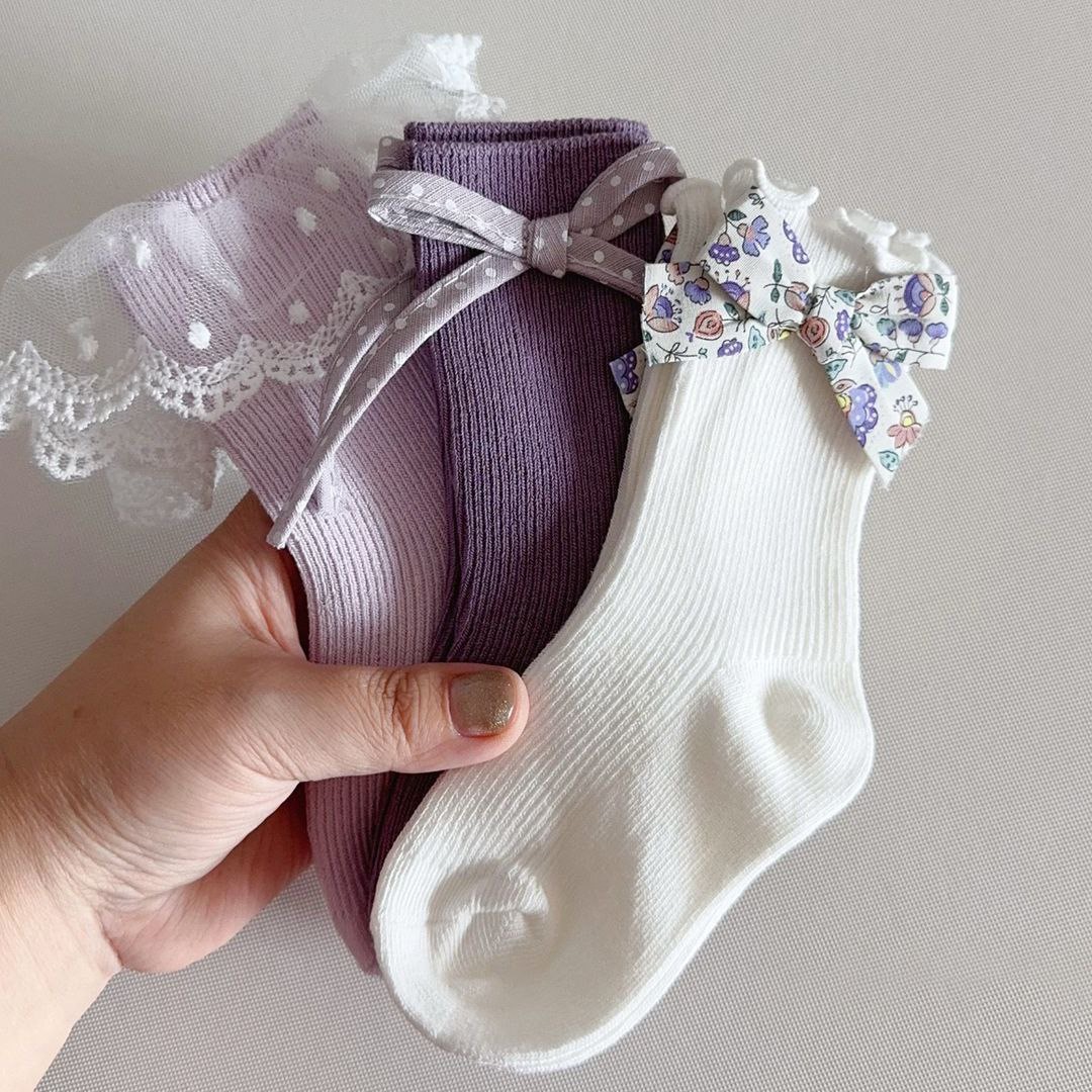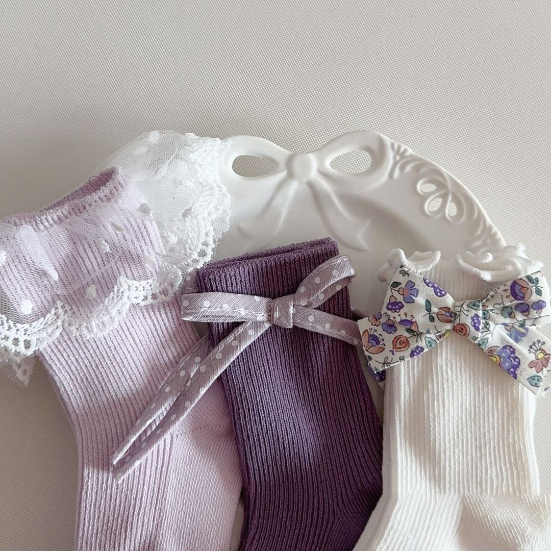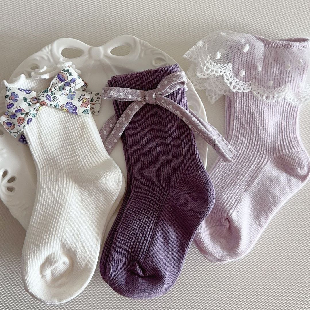 Представляем очаровательный набор из трех пар детских носков, каждая из которых обладает уникальным дизайном. Одна пара выполнена в классическом белом цвете и украшена милым бантиком в цветочный принт. Вторая пара – в насыщенном фиолетовом оттенке, дополнена нежным бантом в горошек. Третьи носки выполнены в светлом лавандовом цвете и декорированы ажурной кружевной резинкой с пудровым узором. Эти милые носочки станут прекрасным дополнением к детскому гардеробу, придавая образу нежность и изысканность.
