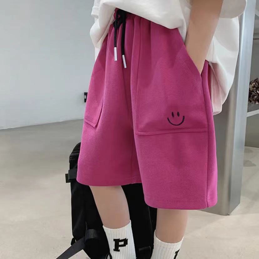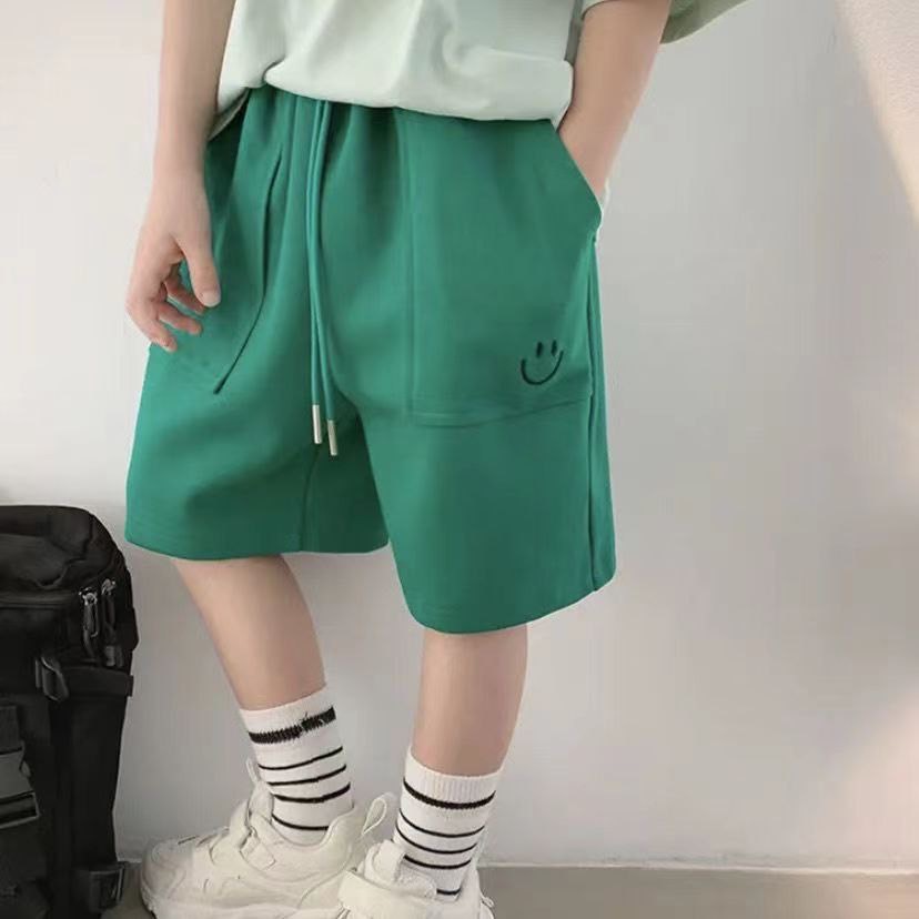 Шорты свободного кроя из плотного мягкого трикотажа подходят для повседневной носки. Пояс на резинке со шнурком помогает отрегулировать посадку по талии, а прямые штанины не сковывают движения. Спереди расположены удобные карманы, на одной стороне — аккуратная вышивка в виде смайла.