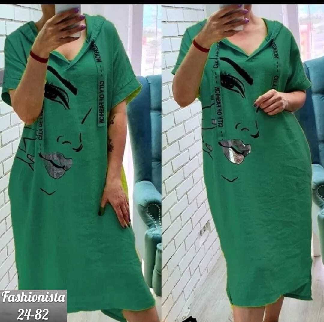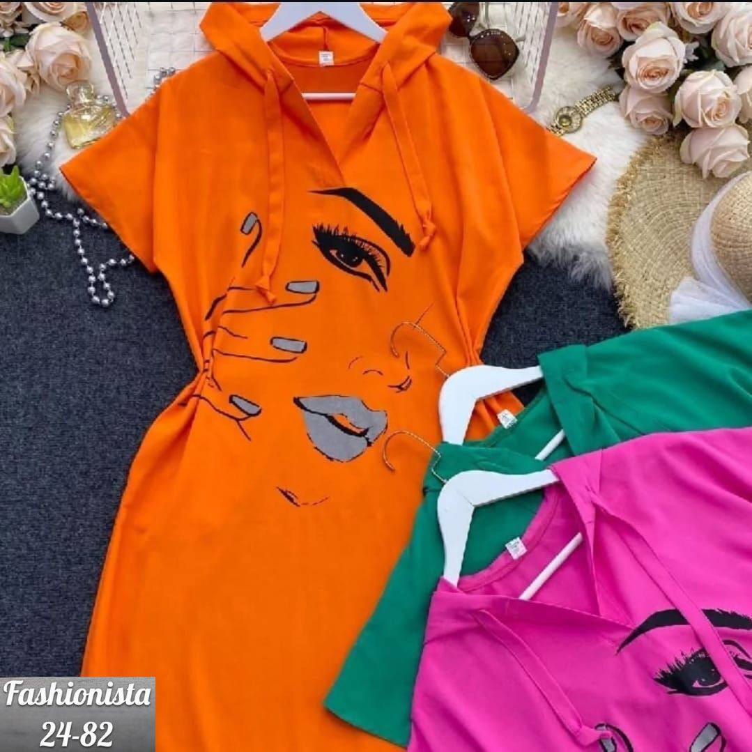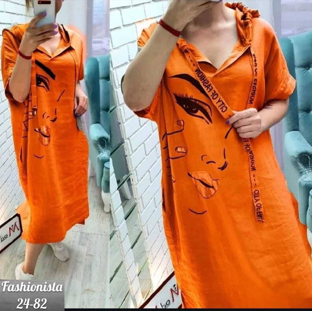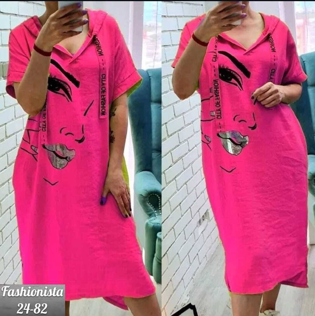 Платье-туника яркого цвета свободного кроя. Модель дополнена капюшоном, застёжкой-молнией и декоративным ремешком. Отличительная особенность — крупный художественный принт с изображением стилизованного лица на передней части изделия. Длина миди, короткие рукава, удобный и непринуждённый фасон. Подходит для повседневной носки, сочетает в себе комфорт и выразительный дизайн. Ткань сингапур.