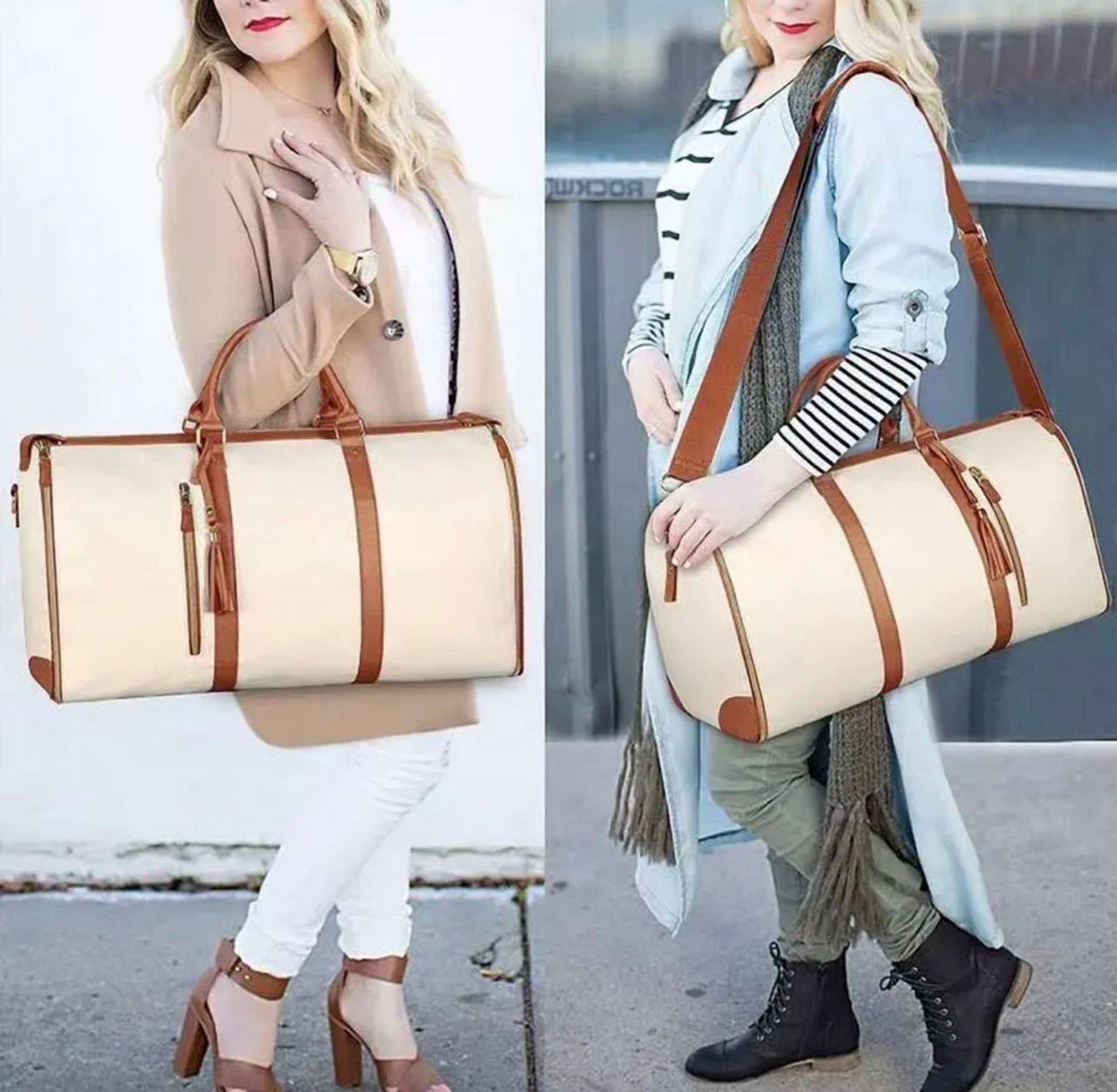 • Стиль и премиум-качество: Сочетание плотного водоотталкивающего канваса кремового цвета и отделки из высококачественной эко-кожи (коньячного оттенка) придает сумке дорогой, «дизайнерский» вид. Элегантная кисточка на замке добавляет изюминку.