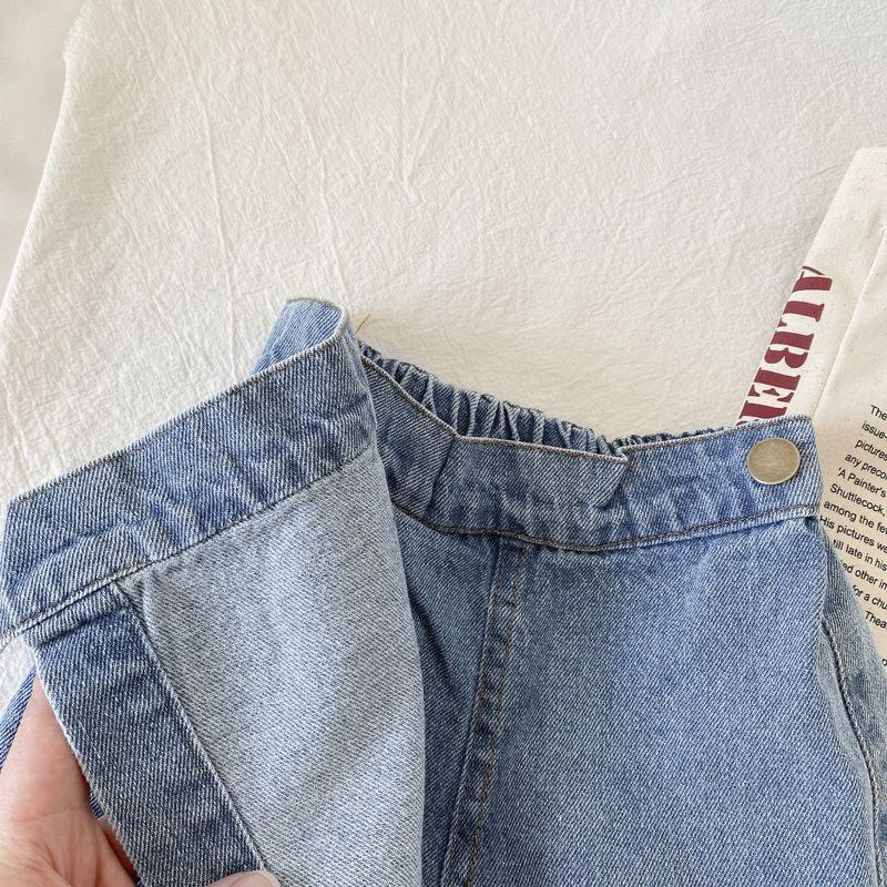 Джинсовые шорты-юбка для девочки с высокой талией. Особенность модели — асимметричный крой с накладным элементом и декоративной пуговицей сбоку. Выполнены из классического денима, обеспечивают комфортную посадку и свободу движений. Практичный вариант для тёплой погоды — подойдёт для прогулок, игр, повседневной носки.