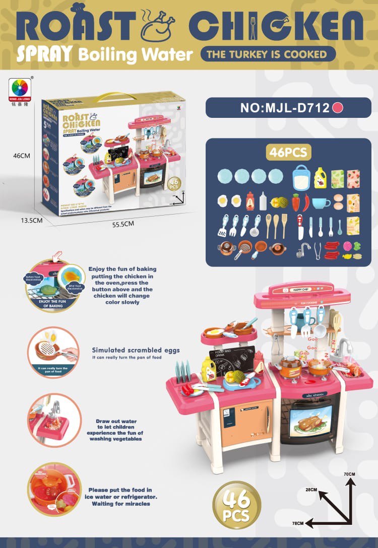 Интерактивная игровая кухня MJL-D7120 представляет собой полноценный кулинарный центр для маленького шеф-повара, включающий 46 разнообразных аксессуаров. Главная особенность набора заключается в невероятной реалистичности процессов: конфорки имитируют кипение с эффектом безопасного холодного пара, а игрушечная курица меняет свой цвет при «запекании» в духовке, наглядно показывая стадию готовности. Игровой процесс дополняется работающей мойкой с циркуляцией воды, что позволяет по-настоящему мыть овощи и посуду, развивая полезные бытовые навыки в формате увлекательной игры.