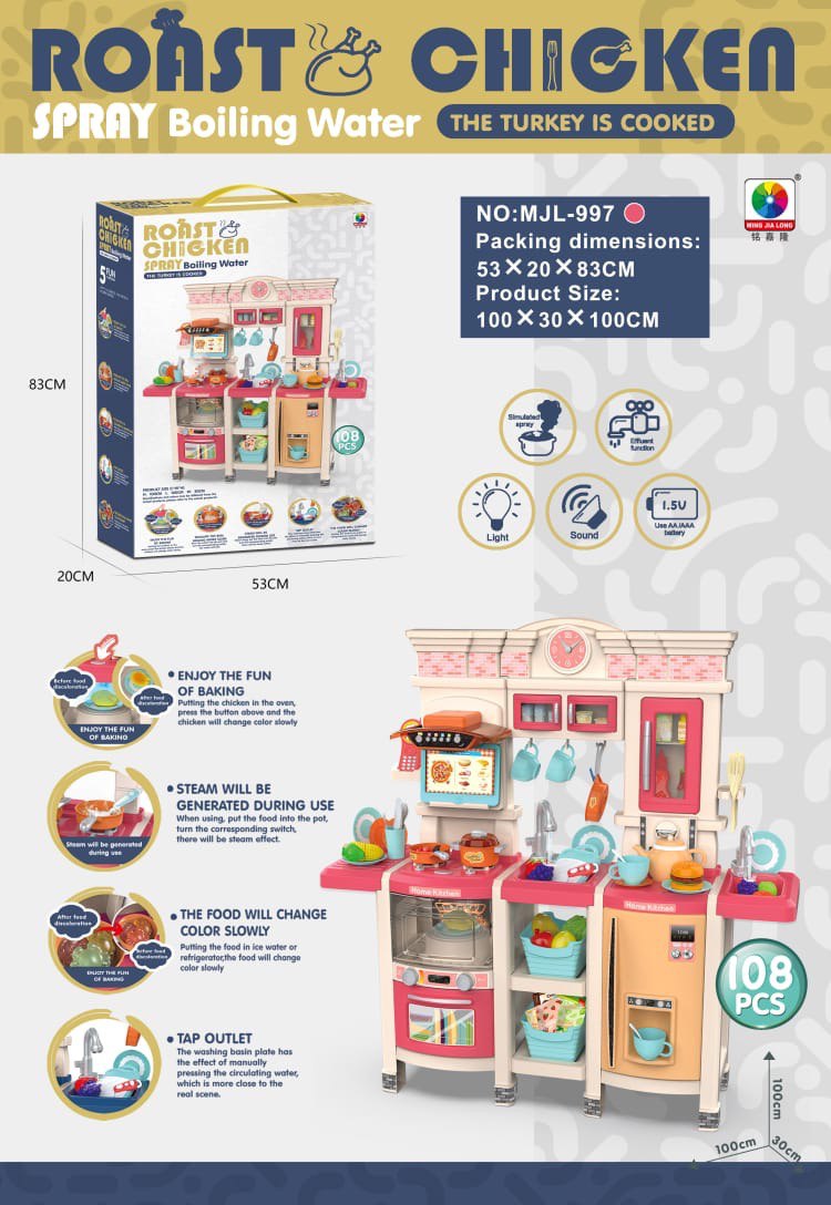 Интерактивная игровая кухня MJL-D7120 представляет собой полноценный кулинарный центр для маленького шеф-повара, включающий 108 разнообразных аксессуаров. Главная особенность набора заключается в невероятной реалистичности процессов: конфорки имитируют кипение с эффектом безопасного холодного пара, а игрушечная курица меняет свой цвет при «запекании» в духовке, наглядно показывая стадию готовности. Игровой процесс дополняется работающей мойкой с циркуляцией воды, что позволяет по-настоящему мыть овощи и посуду, развивая полезные бытовые навыки в формате увлекательной игры.