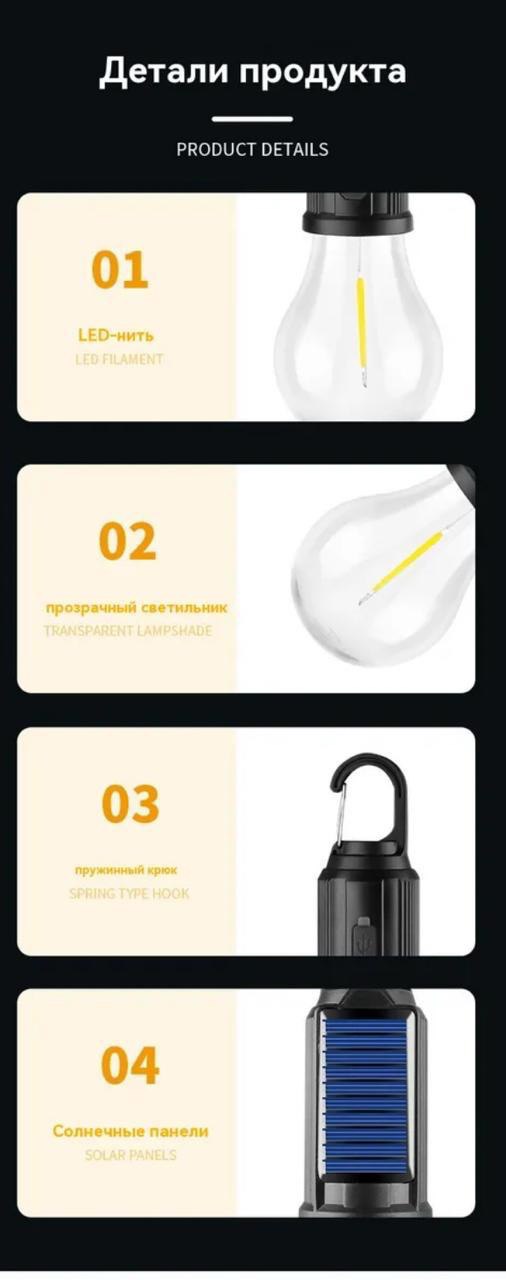 Автономный источник света, который никогда не подведет! Светодиодная лампа-фонарь с двойным типом зарядки (солнечная панель + USB) и удобным крючком для подвешивания. Идеально подходит для походов, рыбалки, освещения беседки или как аварийный свет дома.