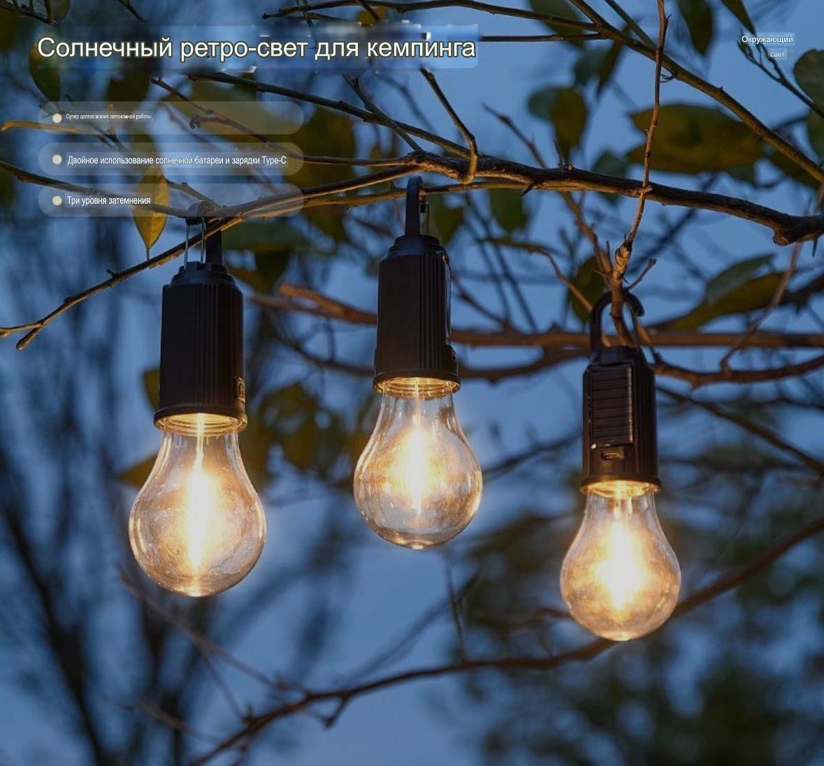 Кемпинговая лампа на солнечной батарее — подвесной светодиодный фонарь для палатки и дачи (USB-зарядка)