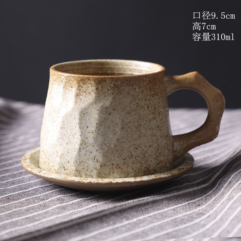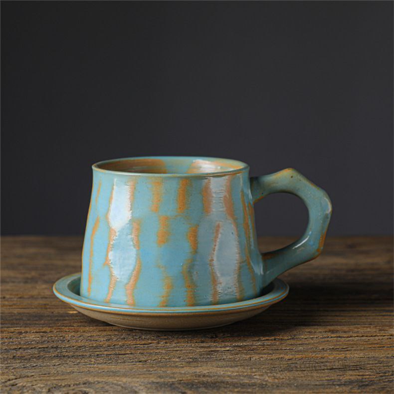 Комплект состоит из кружки и соответствующего блюдца. Изделия отличаются выраженной граненой фактурой корпуса и неоднородным окрашиванием, создающим эффект ручной работы. Набор предназначен для подачи кофе, чая и других горячих напитков.