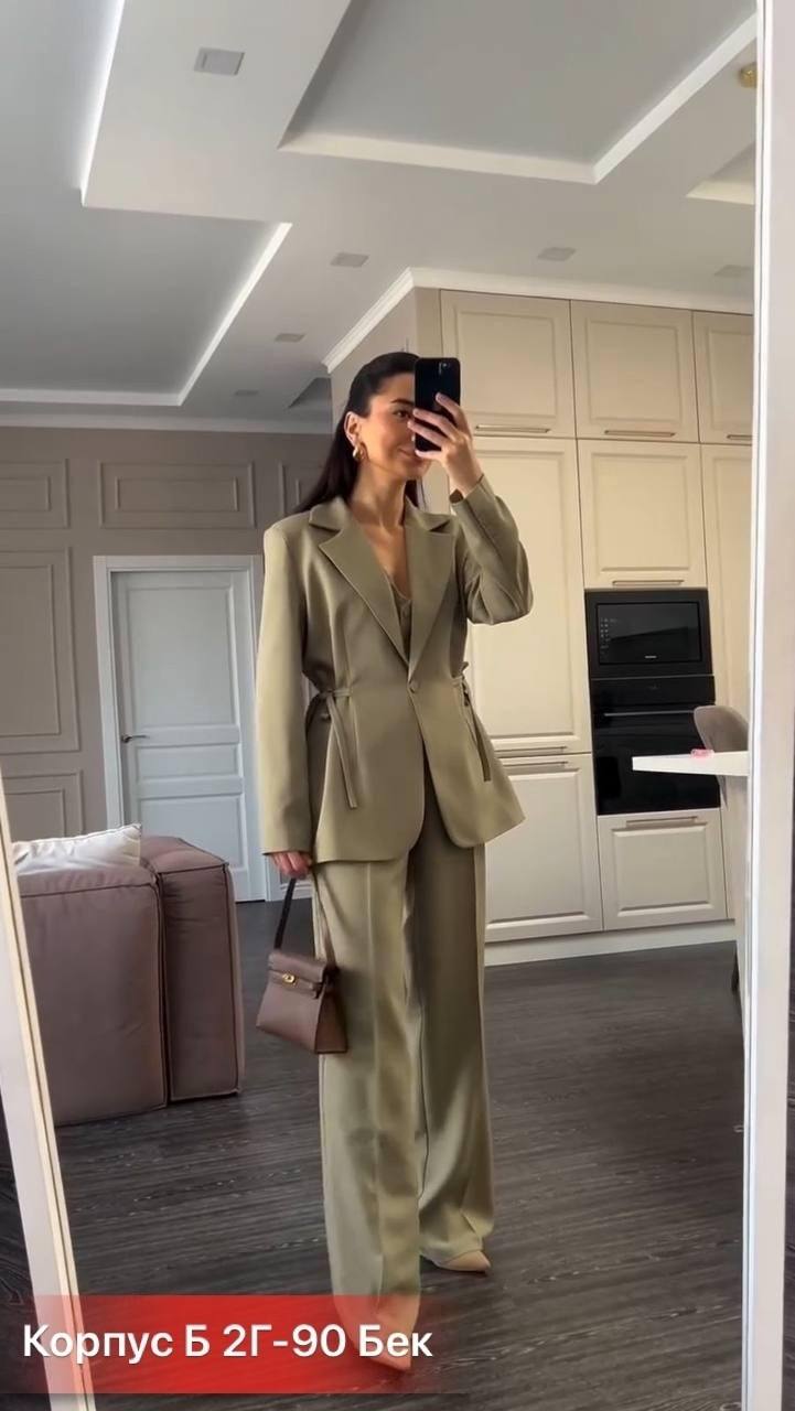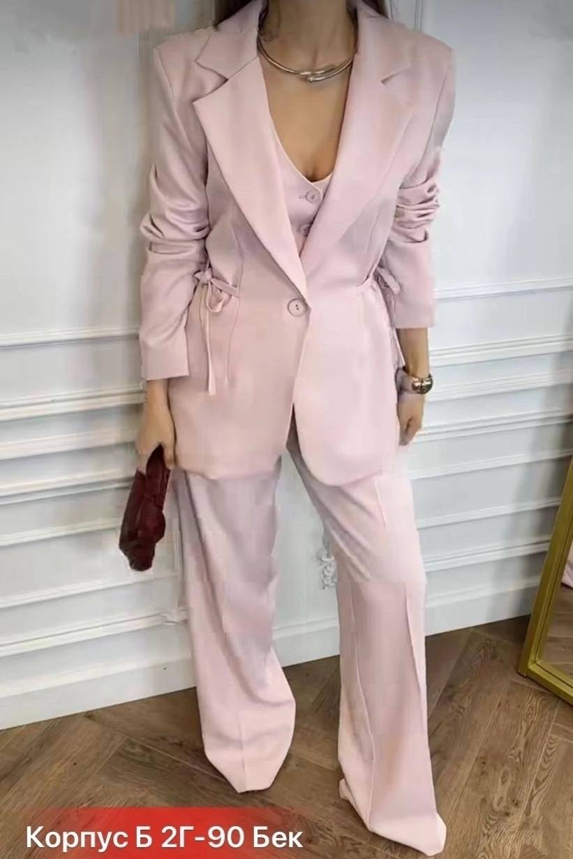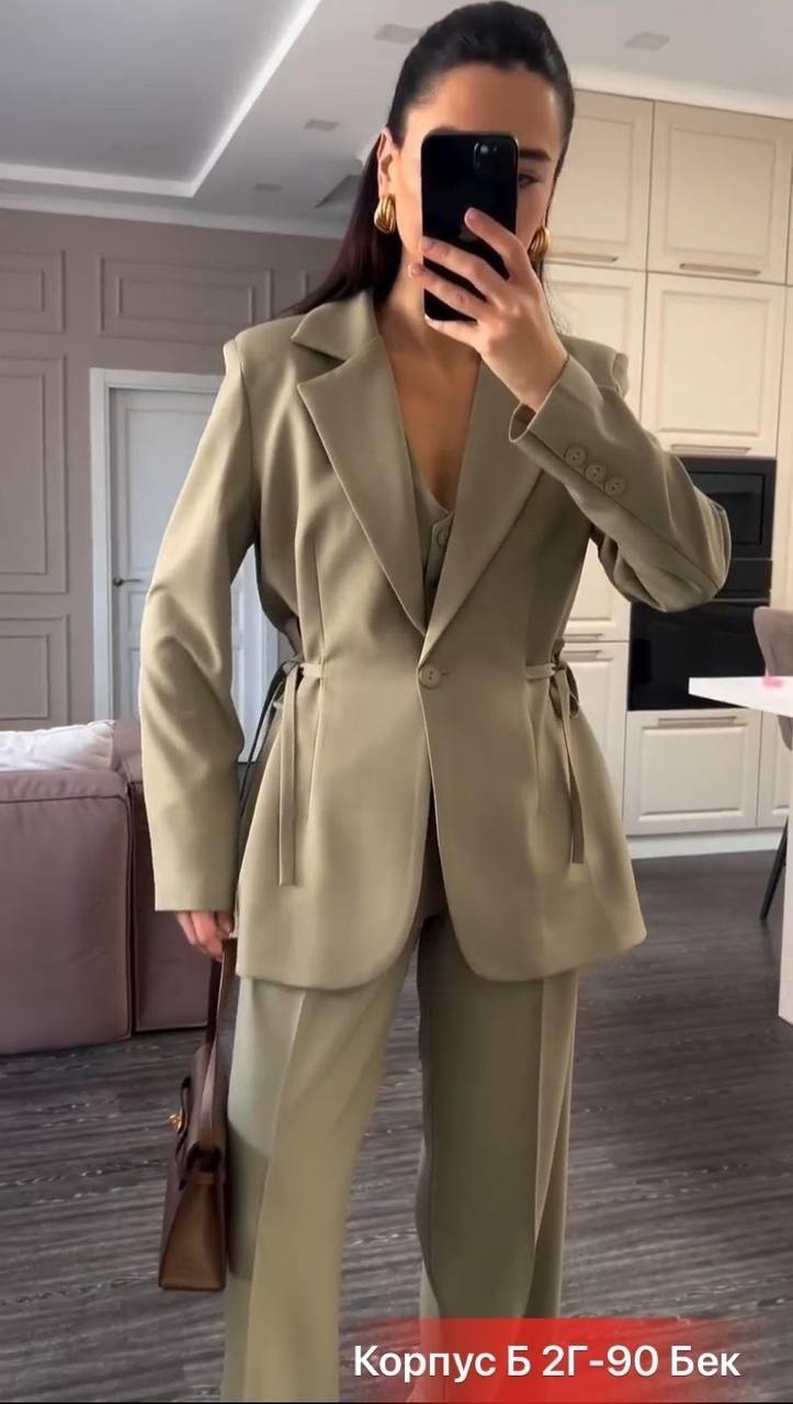 Состоит из пиджака с лацканами и застёжкой на одну пуговицу, широких брюк свободного кроя и жилета с V-образным вырезом. Пиджак дополнен декоративными завязками на талии, что придаёт модели женственность. Комплект сочетает элегантность и комфорт, подойдёт для деловых встреч и повседневных образов. Ткань: Рим (плотная/держит форму) полностью на подкладке.