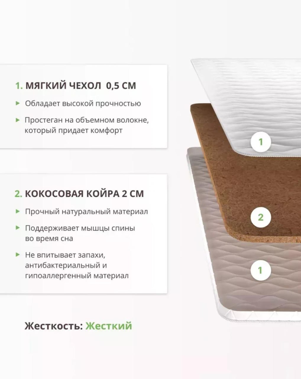 Кокосовая койра — это экологически чистый и долговечный материал, широко применяемый в производстве матрасов и ортопедических изделий. Этот слой является основой для создания идеальной поддержки и комфорта во время сна.