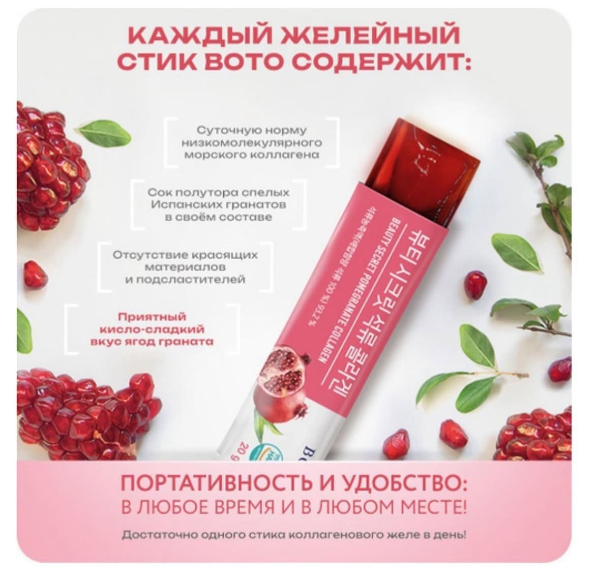 Корейский коллаген - класса, в состав которого входит низкомолекулярный морской коллаген и концентрат 100% натурального граната, в форме стиков с желе.