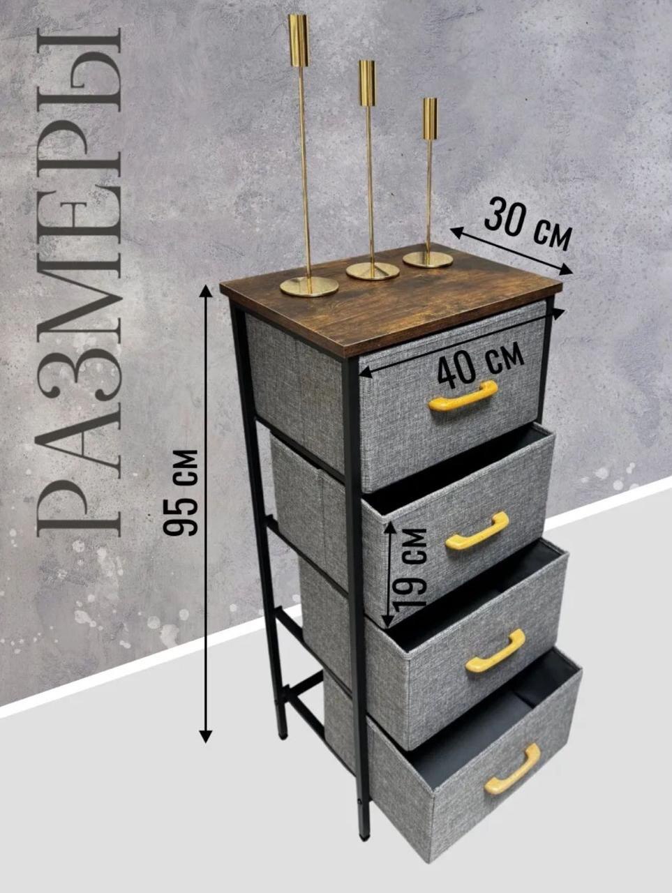 • Функциональные ящики: Четыре вместительных тканевых ящика с удобными желтыми ручками позволяют удобно хранить одежду, белье, аксессуары, документы или другие мелочи. Глубина каждого ящика составляет 19 см, что позволяет разместить в них достаточно объемные предметы.