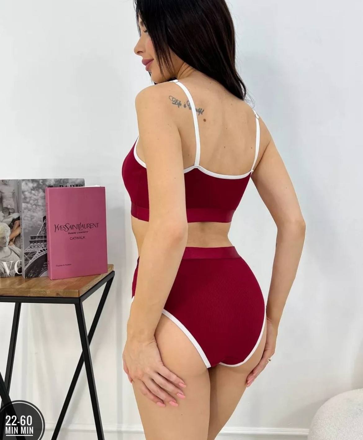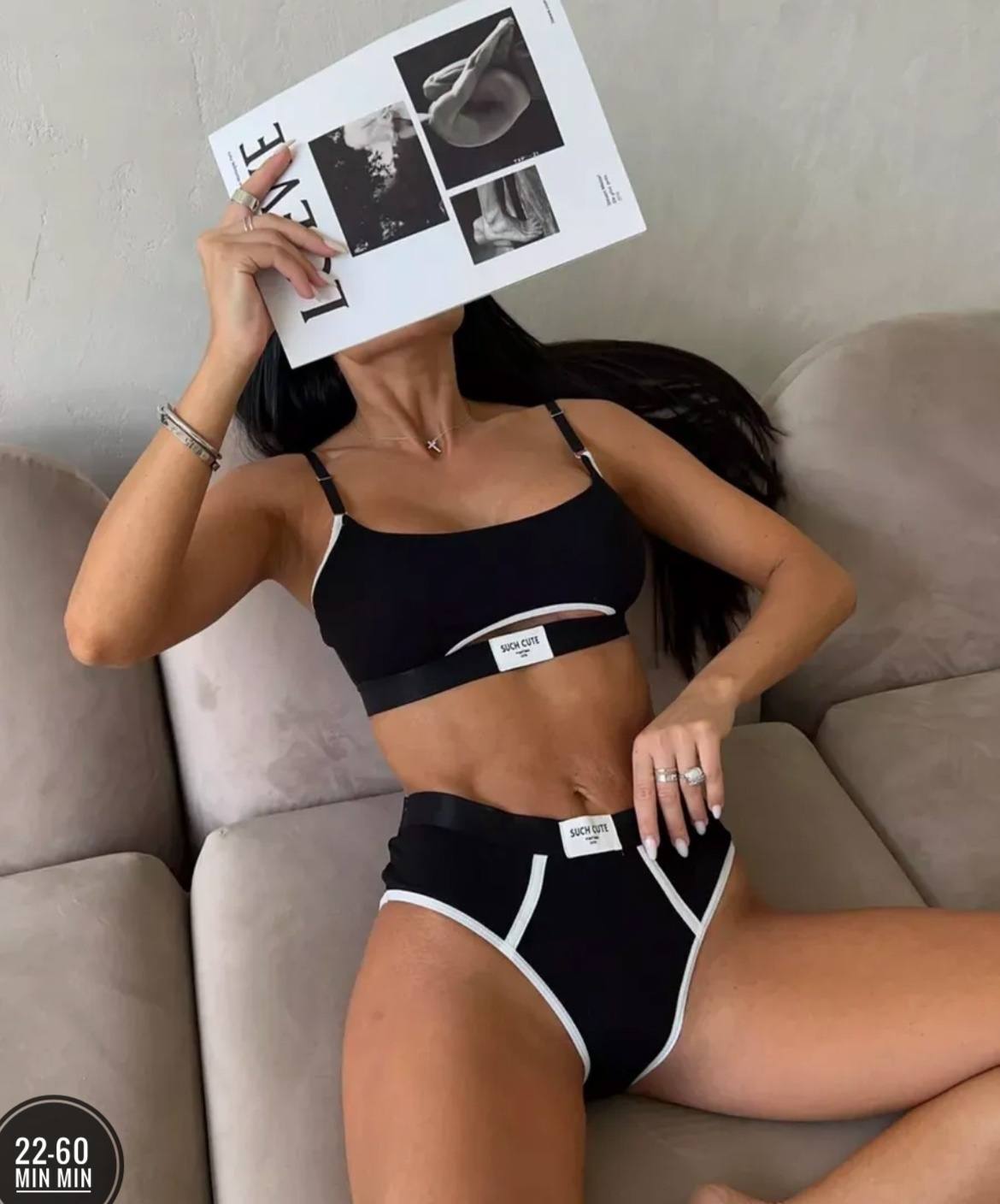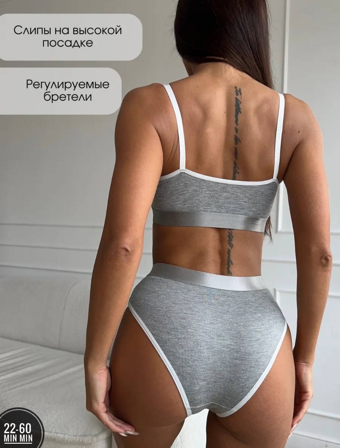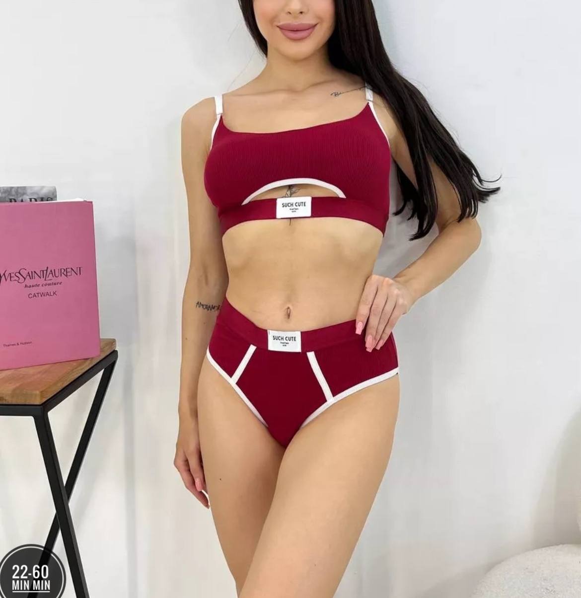 Комплект нижнего белья «SUCH CUTE» состоит из бесшовного лифа-топа без косточек и трусиков с завышенной талией (модель слипы). Топ выполнен в спортивном стиле, оснащён съёмными поролоновыми вставками для лёгкого эффекта push-up. Трусики плотно облегают фигуру, не вызывают раздражений. Материал — хлопок с добавлением спандекса (95% хлопка, 5% спандекса), приятный на ощупь. Комплект подходит для повседневной носки, занятий спортом, сна.
