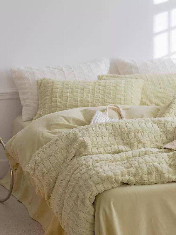 • Пододеяльник и две фисташковые наволочки имеют выраженную объемную текстуру в виде квадратов (похоже на вафельное плетение, но очень мягкое, плюшевое, возможно, из искусственного меха или микрофибры/шерпы). Выглядит очень мягким и уютным.