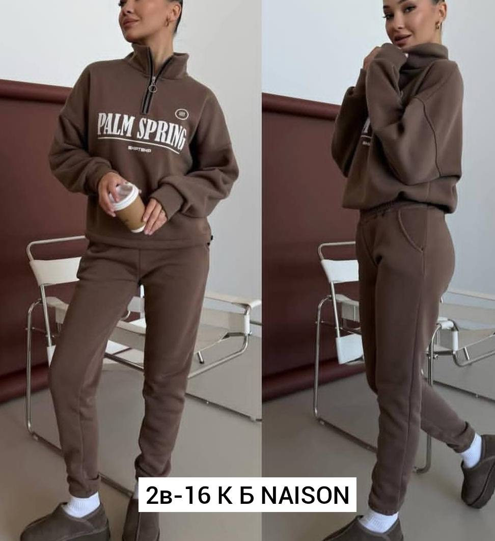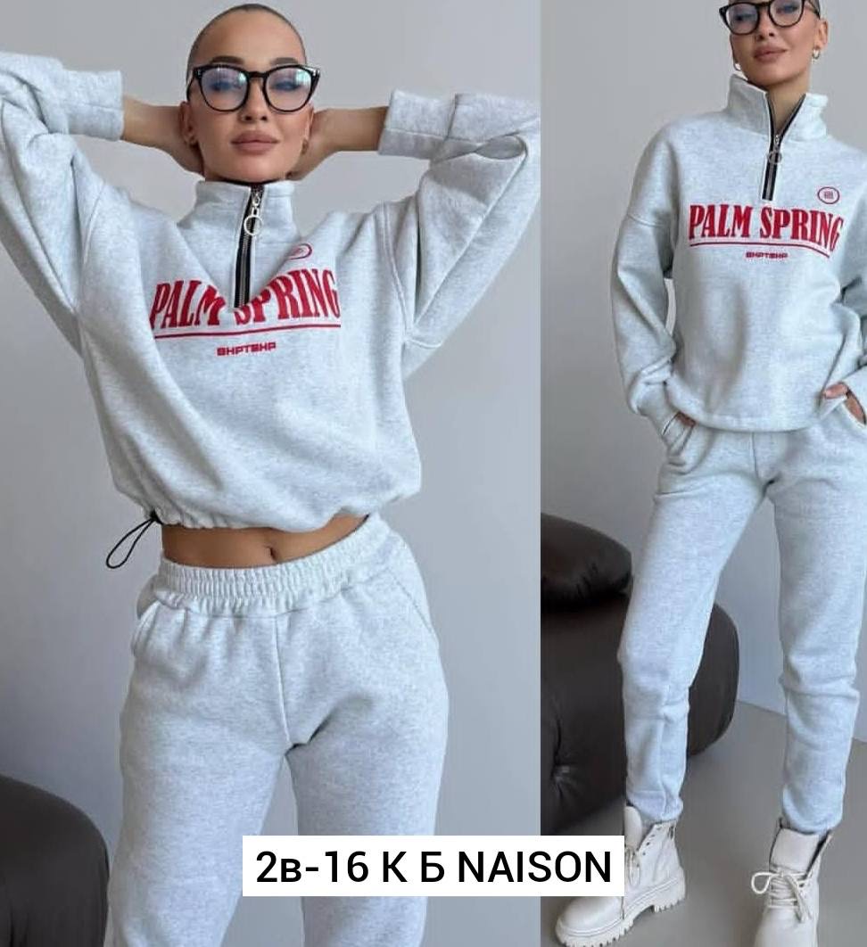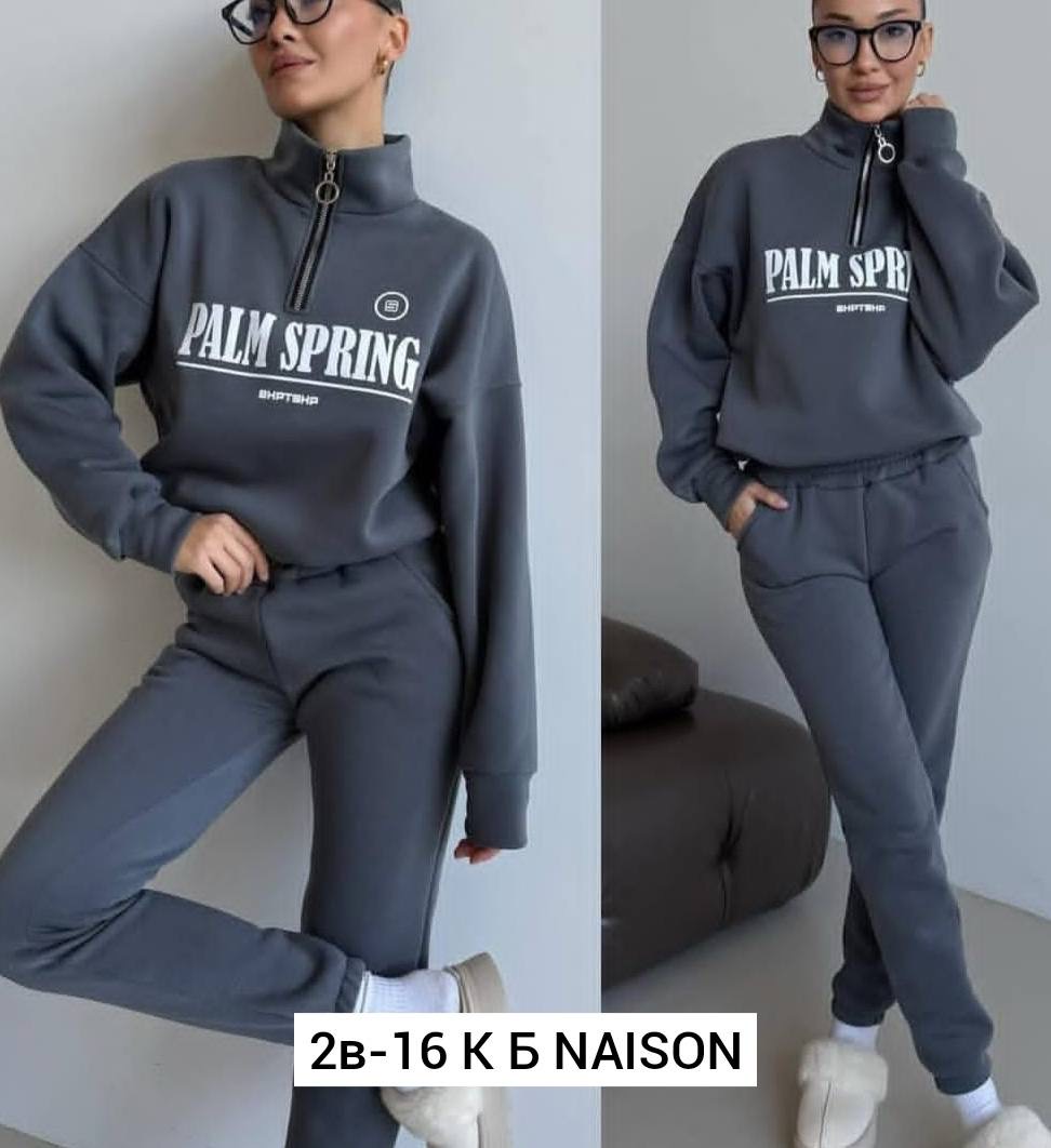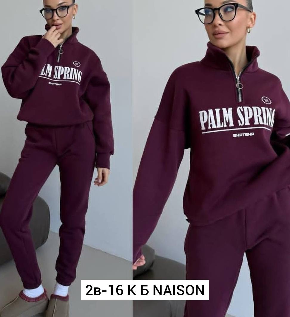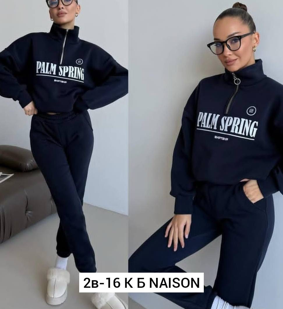 Женский спортивный костюм «Palm Spring» состоит из укороченной толстовки с молнией и брюк. Толстовка выполнена с длинными рукавами и высоким воротом, украшена крупной надписью «Palm Spring» на груди. Брюки прямого кроя с эластичным поясом. Костюм изготовлен из мягкого флисового материала (трехнитка флис с начесом). Подходит для повседневной носки, прогулок, занятий спортом и домашнего отдыха.