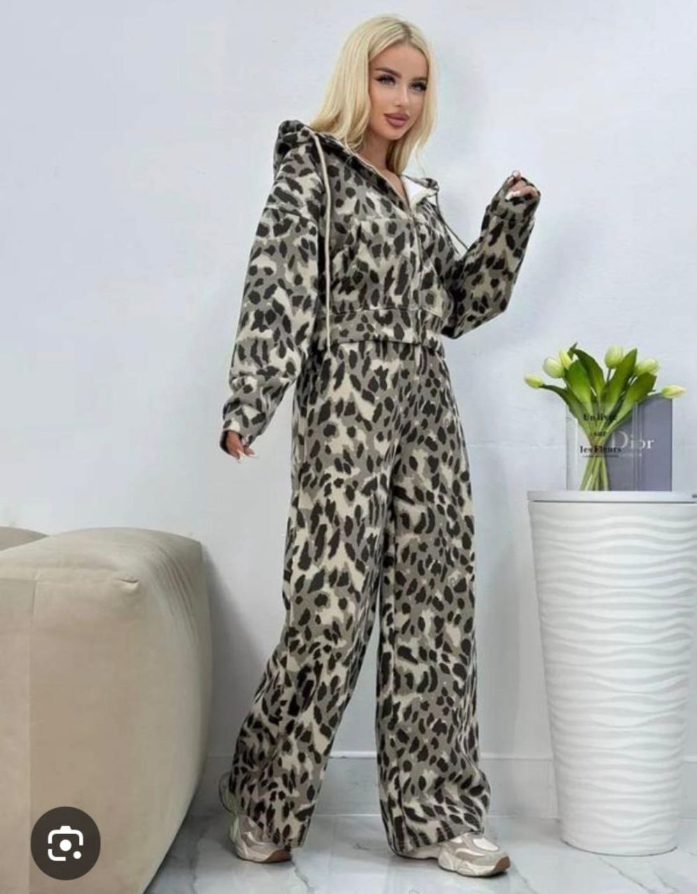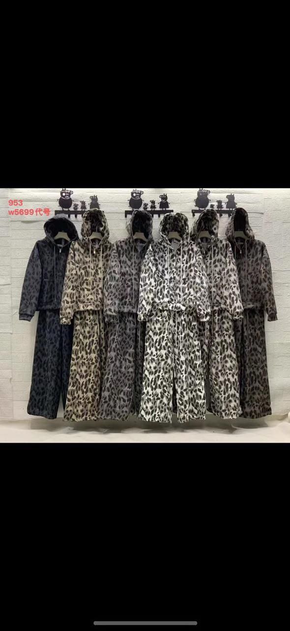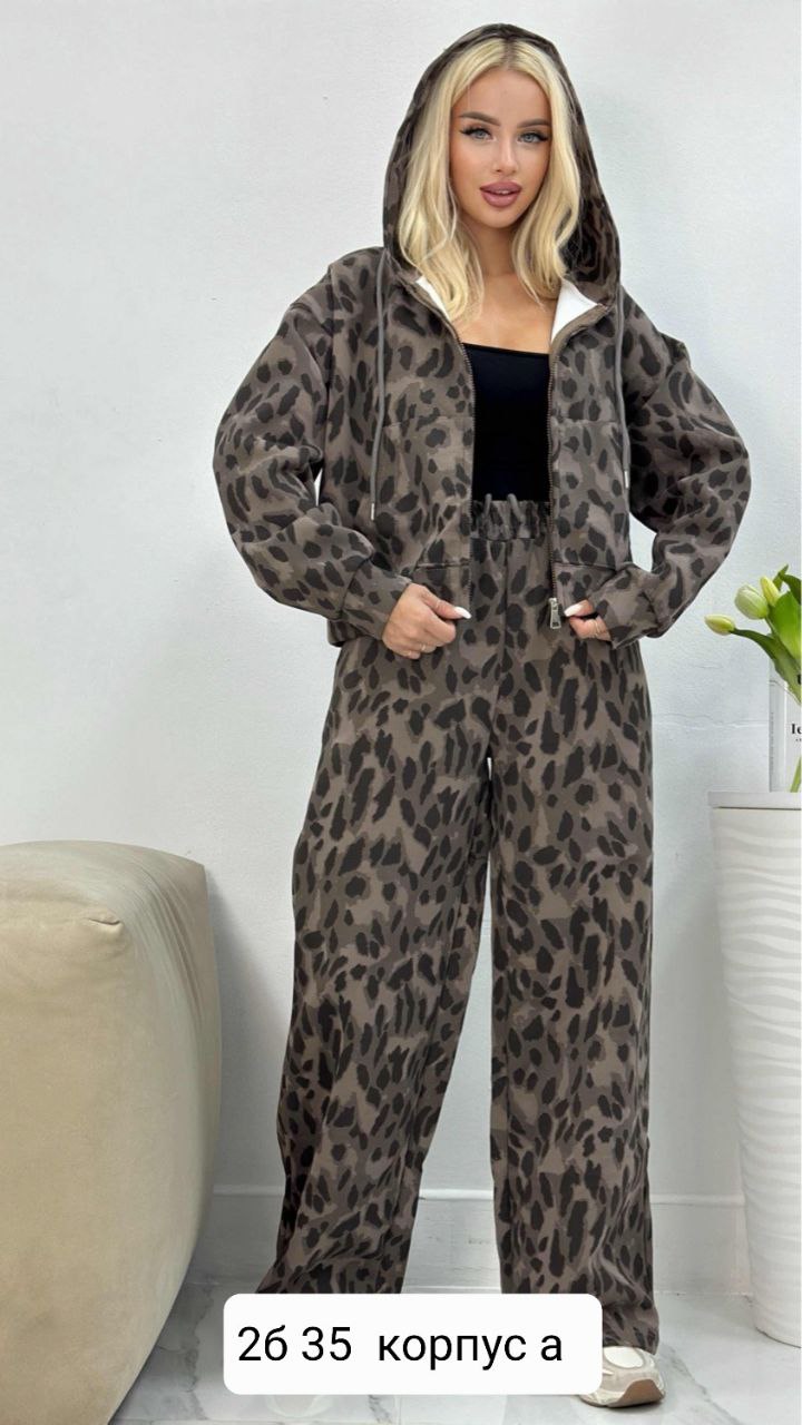 Женский спортивный костюм с леопардовым принтом, состоящий из укороченной кофты с капюшоном и брюк свободного кроя. Материал с начесом обеспечивает комфорт и тепло. Костюм застёгивается на молнию, оснащён накладными карманами. Принт в леопардовой гамме представлен в нескольких цветовых вариациях: от тёмно-коричневого до светло-бежевого с чёрными пятнами. Практичный вариант для прогулок, занятий спортом или домашнего использования. Размер единый.