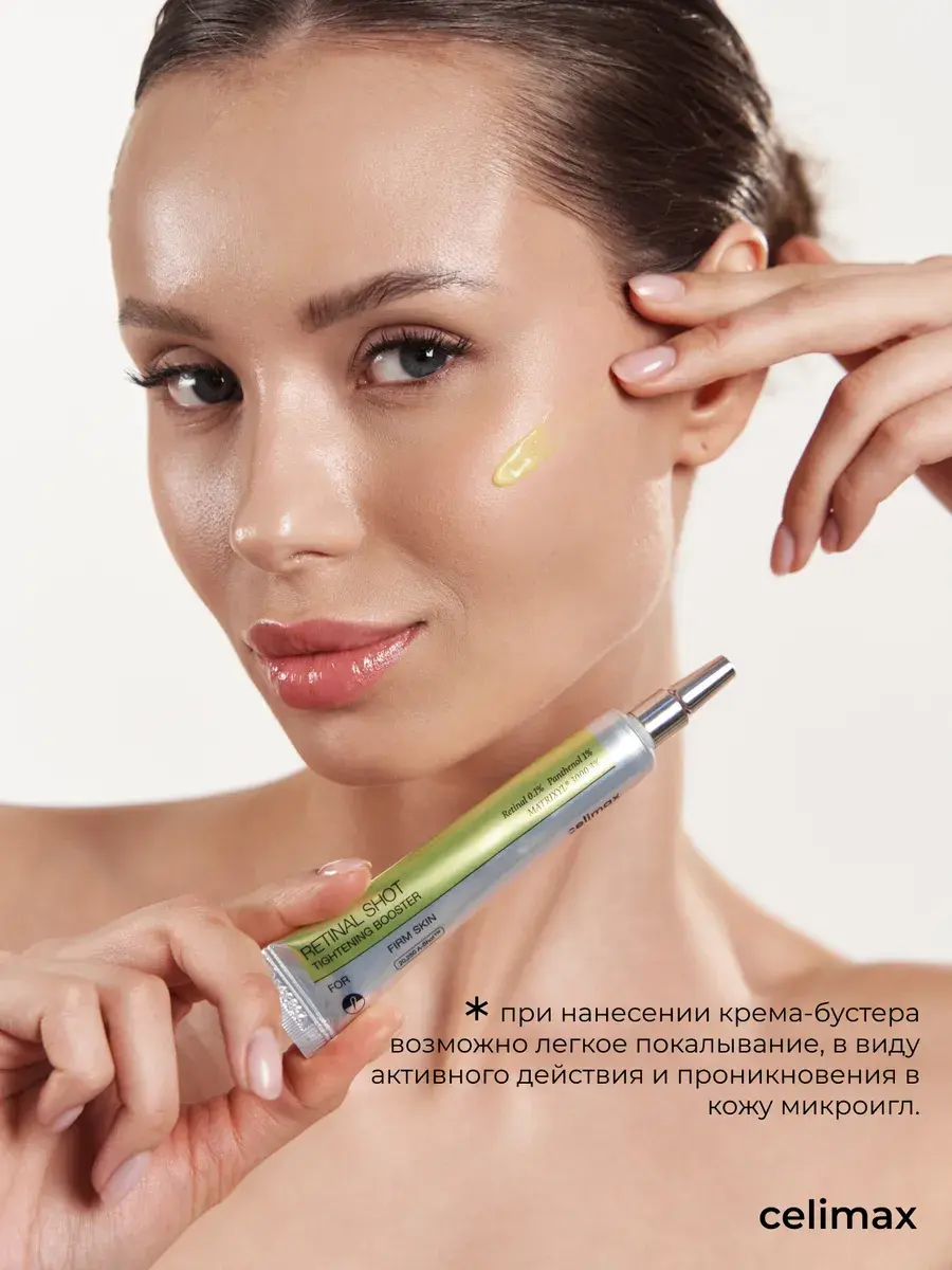 Celimax The Vita-A Retinol Shot Tightening Booster — это инновационный бустер с микроиглами для интенсивного антивозрастного ухода. Бустер - это концентрат, усиливающий эффект действия других средств, таких как крема и сыворотки. Формула с ретиналем и другими активными компонентами направлена на борьбу с морщинами, улучшение текстуры кожи и повышение её упругости. Бустер Селимакс легко распределяется и быстро впитывается, не оставляя жирного блеска, и оказывает особенно выраженный эффект в наиболее проблемных зонах, таких как носогубная и межбровная складки, «гусиные лапки», зона расширенных пор и др. Главный компонент в составе бустера - спикулы (микроиглы) – основы скелета морской губки, обладающие пористой структурой, что позволяет им впитывать в себя питательные вещества и передавать их коже при дальнейшем соприкосновении. Образовывая на поверхности эпидермиса микроскопический прокол, микроиглы проникают глубоко в кожу и начинают взаимодействовать с клетками, передавая полезные элементы через собственные поры. Микроиглы имеют высокую способность к стимуляции кровообращения и разглаживанию заломов. Нано-ретиналь в концентрации 0,1% в составе отличается от ретинола более мягкой и усовершенствованной формулой, особенно эффективной не только в борьбе с морщинами, но и в сужении пор и коррекции акне. Способствующий синтезу коллагена и стимуляции обновления клеток, ретиналь помогает значительно сократить количество морщин и улучшить текстуру кожи. Дополняет формулу бустера запатентованный пептид MATRIXYL 3000 3%, обеспечивающий повышение эластичности и упругости кожи. Уже после первых применений бустера заметны улучшения в состоянии кожи - морщины становятся менее заметными, кожа выглядит упругой и эластичной, а её текстура выравнивается. Для максимального эффекта от применения бустер рекомендуется использовать с лифтинг-сывороткой с микроиглами.