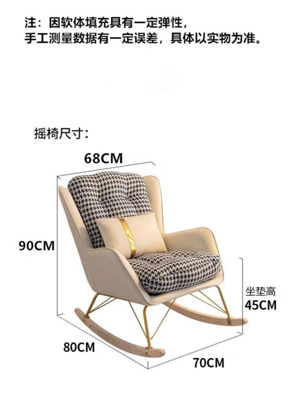 • Изысканный дизайн: Сочетание классической формы кресла-качалки с современными акцентами делает его настоящим украшением интерьера. Обивка в трендовом узоре "гусиная лапка" (и возможны другие варианты) придает креслу элегантность и шарм. Лаконичные линии и изящные металлические ножки золотистого цвета подчеркивают утонченный вкус его обладателя.