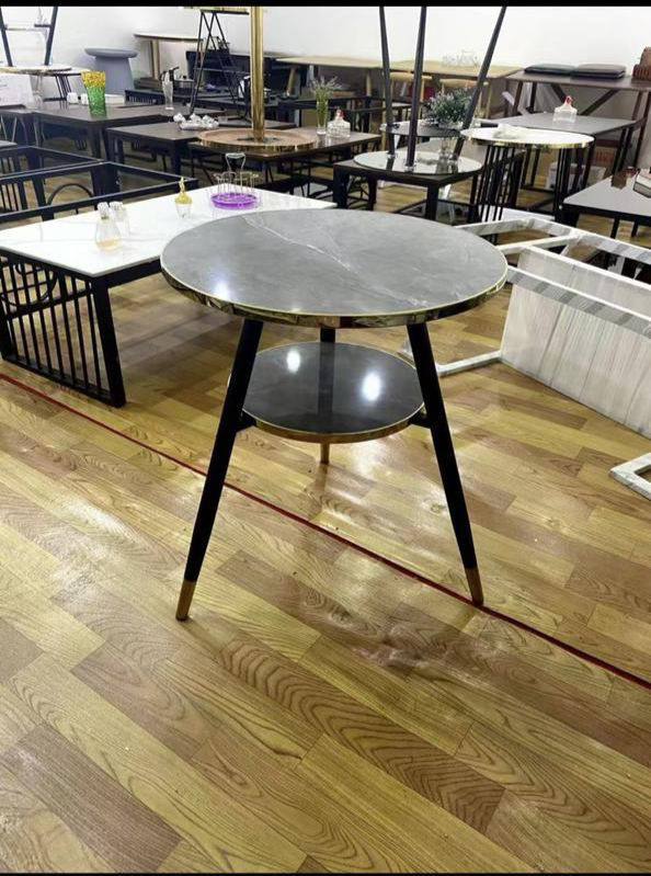 Элегантный стол в современном стиле — идеальное решение для кухни, кафе или гостиной. Столешница с изысканным мраморным узором в серых тонах сочетается с лаконичными чёрными ножками, украшенными золотистыми акцентами.