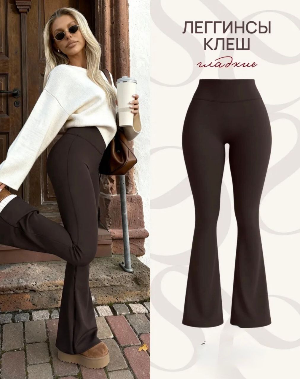 Леггинсы клёш с высокой посадкой, выполненные из гладкого эластичного материала стрейч, эластан. Модель отличается облегающим силуэтом в верхней части и расширением к низу, что создаёт стильный и современный образ. Подойдут как для повседневной носки, так и для занятий спортом — обеспечивают свободу движений и комфорт.