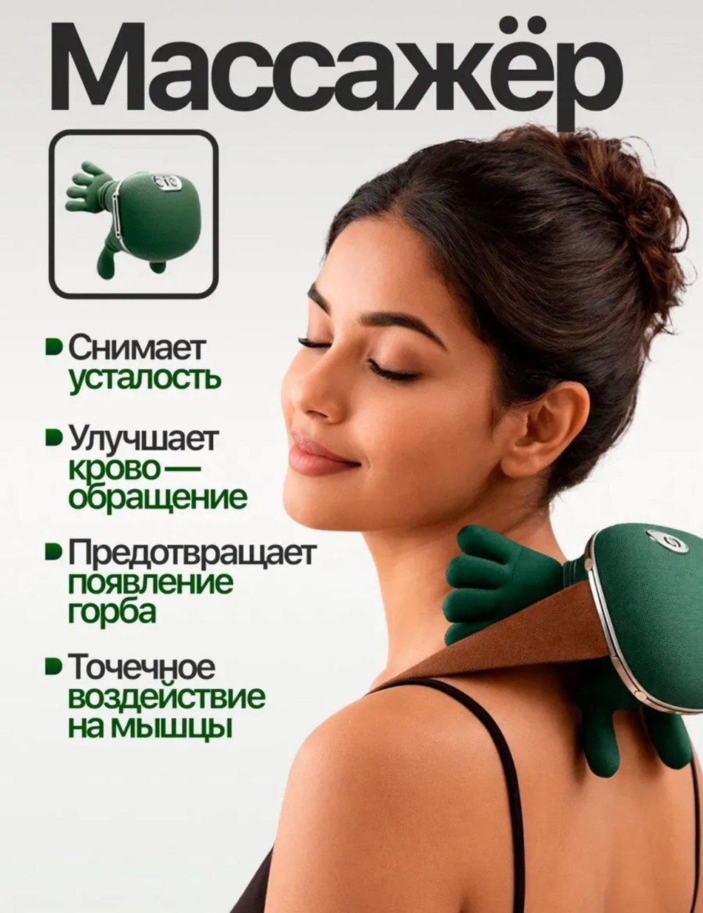 - Снимает усталость: Благодаря мягкому воздействию, массажёр помогает расслабиться после напряжённого рабочего дня, устраняя чувство тяжести и напряжения в мышцах.