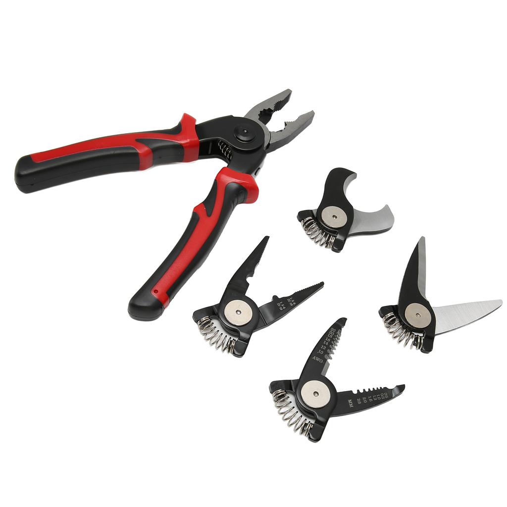 Эргономичный инструмент с красными акцентами объединяет 5 функций: резку проводов, работу с металлическими деталями, обрезку электропроводов, зачистку изоляции и обжим контактов. Сменные насадки крепятся за одно движение — экономия времени и места в инструментальном ящике.
