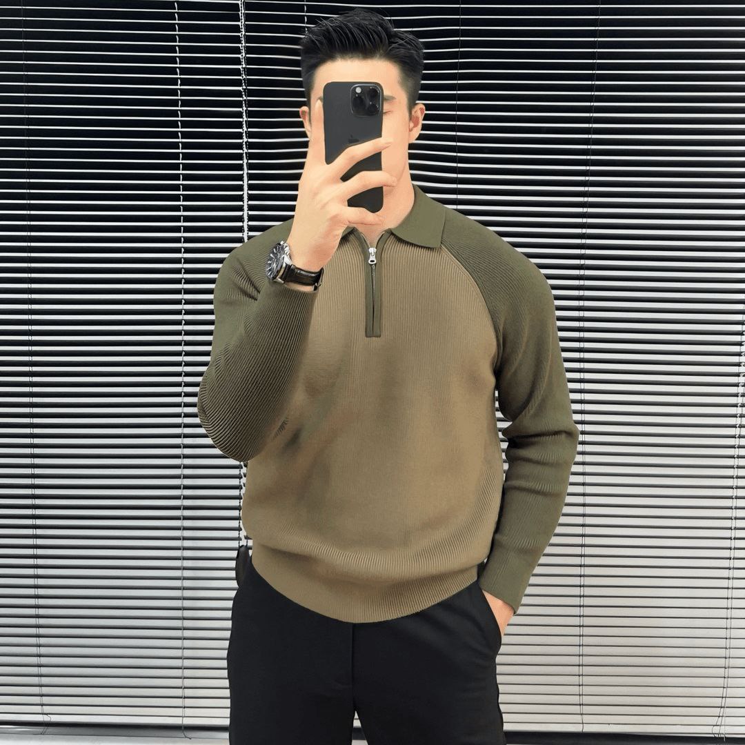 Мужской джемпер на молнии с воротником-поло. Выполнен в спокойных оттенках с чуть более светлыми, либо тёмными вставками на плечах и рукавах — создаёт интересный визуальный контраст. Модель отличается лаконичным дизайном: прямой крой, длинные рукава, короткая молния в области воротника. Ткань выглядит мягкой и эластичной, комфортно облегает торс без стеснения движений. Практичный вариант для повседневных образов — легко комбинируется с классическими брюками или джинсами.