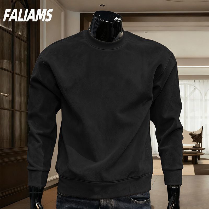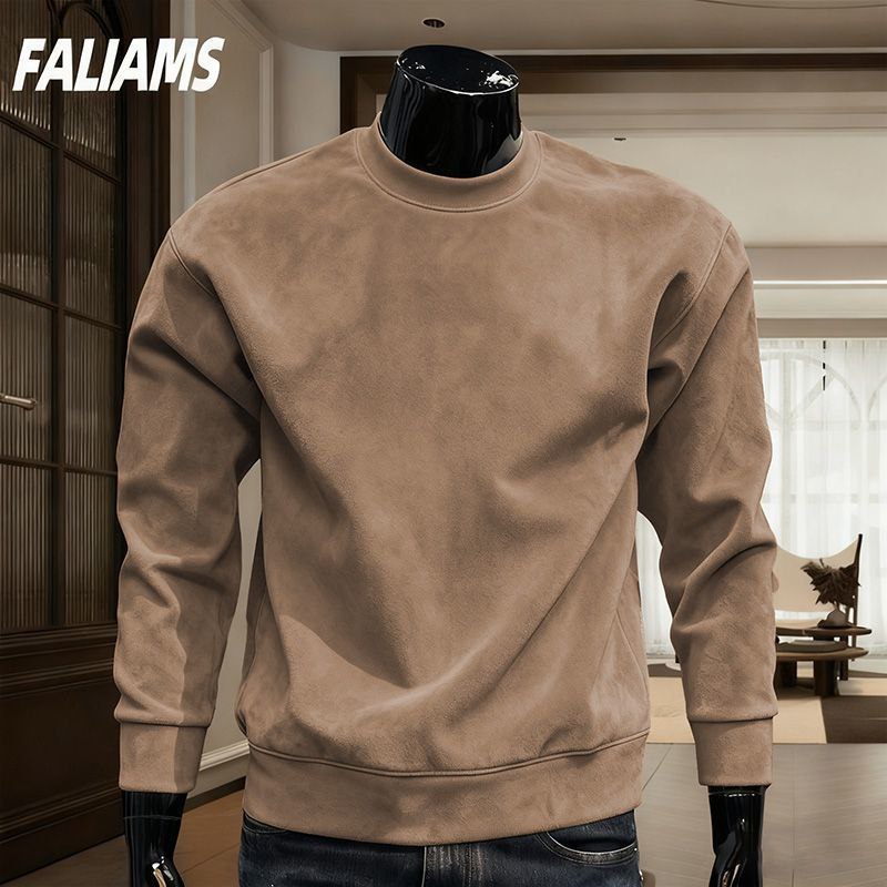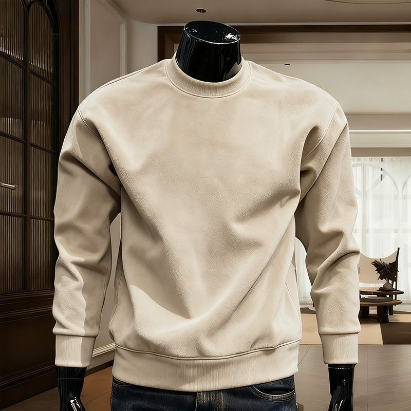 Мужской свитшот с круглым вырезом и длинными рукавами. Выполнен из материала замша — выглядит стильно и необычно. Свободный крой не сковывает движения, делает модель удобной для повседневной носки. лаконичный однотонный дизайн подойдёт для сочетания с разными элементами гардероба.