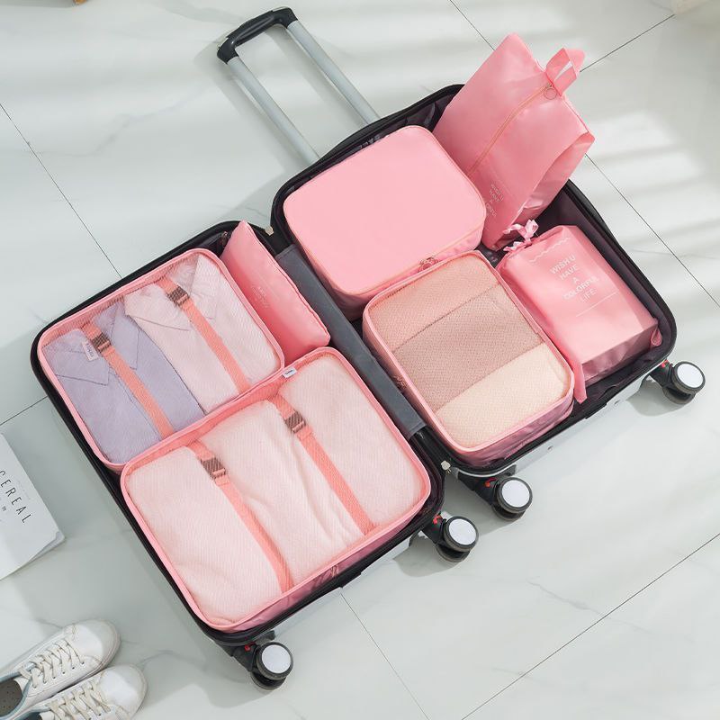 Комплект износостойких чехлов, предназначенный для систематизации вещей и оптимизации пространства внутри багажа. Органайзеры выполнены из легкого водонепроницаемого нейлона, защищающего содержимое от влаги и пыли. В набор входят сумки различного назначения: сетчатые кофры для верхней одежды, закрытые мешочки для белья и обуви, а также плоские косметички для аксессуаров и документов. Сетчатые вставки обеспечивают естественную вентиляцию и позволяют быстро идентифицировать содержимое, не открывая молнию. Изделия оснащены ручками для переноски и внутренними фиксирующими ремнями.