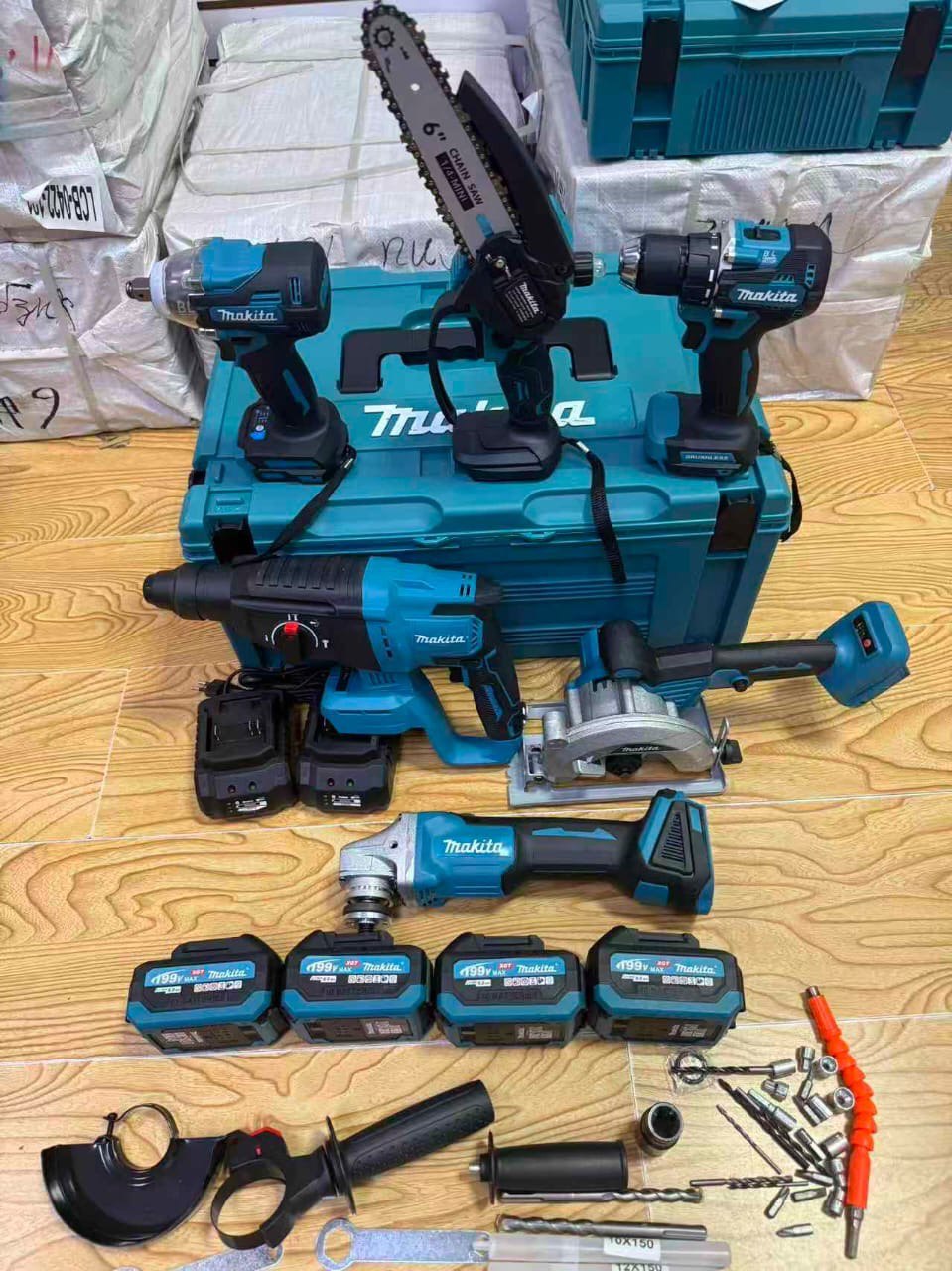 Комплект дополнен четырьмя аккумуляторами (199 В), зарядным устройством, набором насадок, свёрл и крепёжных элементов, а также защитным кожухом и рукоятками. Инструменты размещены в фирменном кейсе Makita для удобной транспортировки и хранения.