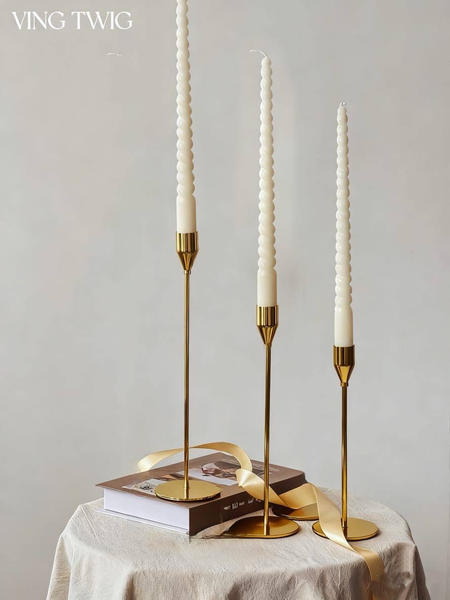 Золотые подсвечники прекрасно сочетаются с витыми белыми свечами, как показано на фото. Контраст между тёплым металлическим блеском и нежной текстурой свечей создаёт атмосферу уюта и торжественности. Такой дуэт подойдёт для: