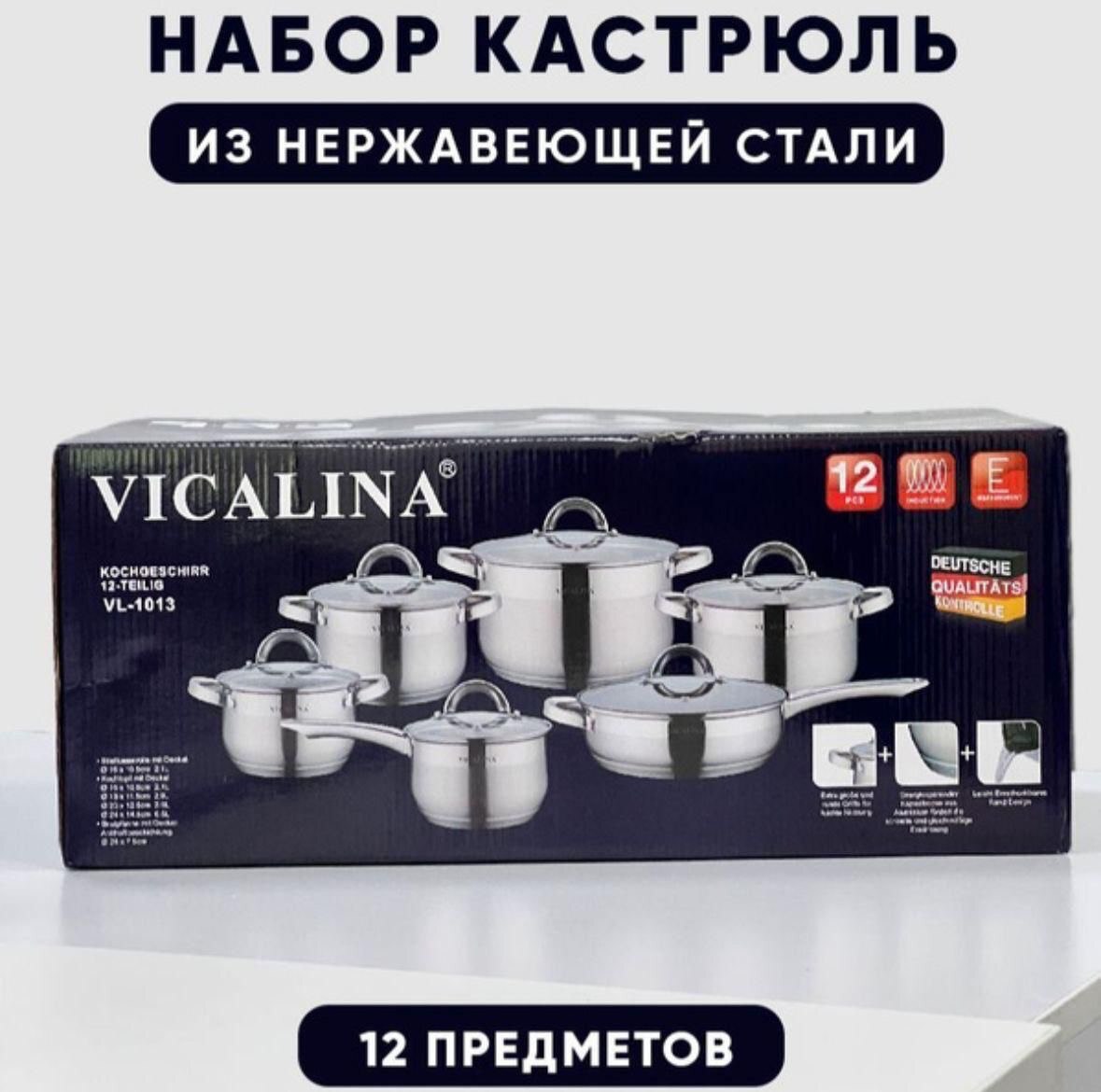 Набор кастрюль Vicalina VL-1013 — это комплект из 12 предметов, включающий шесть кастрюль разного объема и сковороду диаметром 24 см, каждая с крышкой из жаропрочного стекла. Изготовлен из высококачественной нержавеющей стали марки 18/10 с толщиной стенок 0,5 мм, что гарантирует долговечность и надежность в эксплуатации.