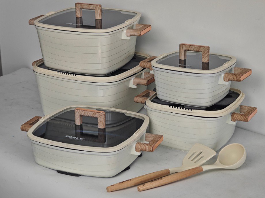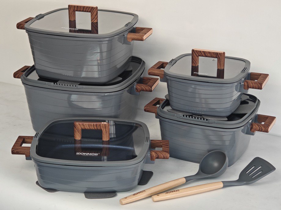 • Универсальность: готовка, тушение, запекание и сервировка одним набором