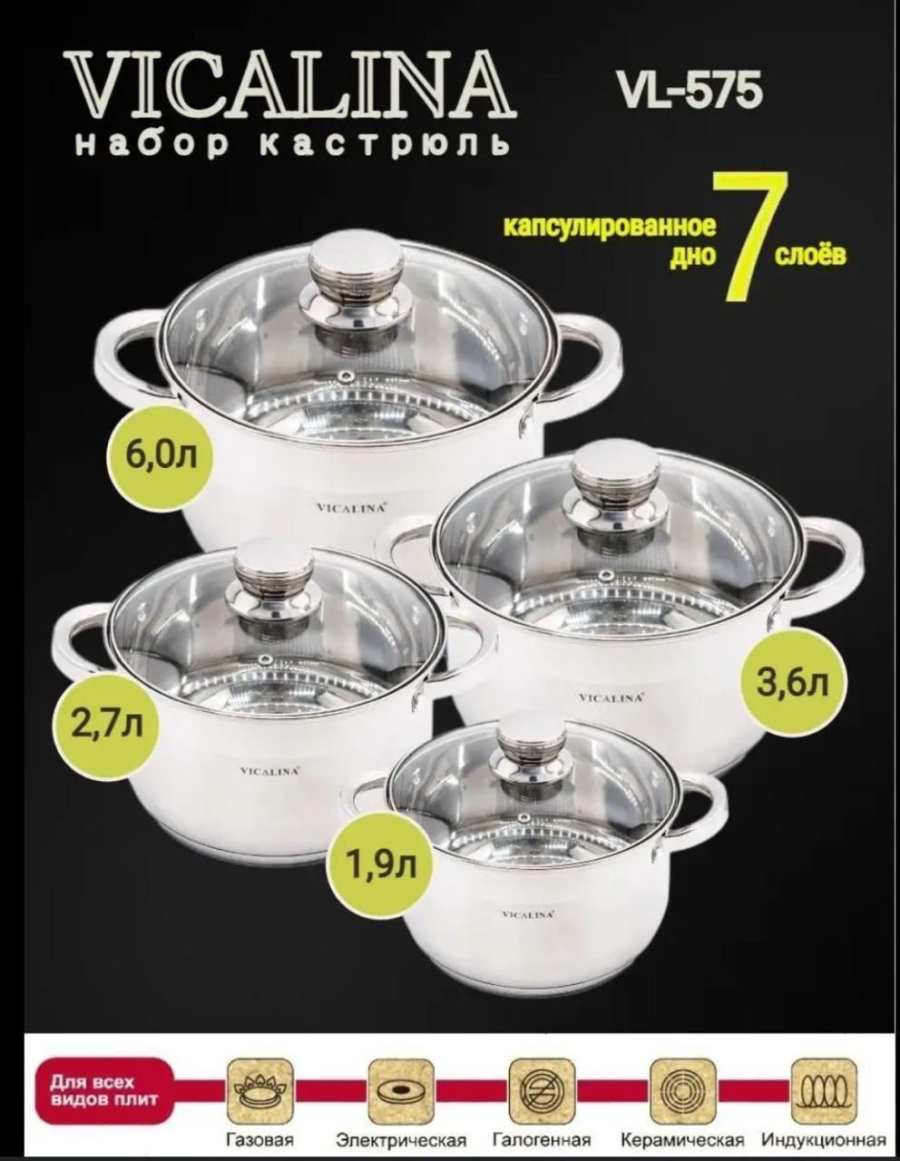 Набор кастрюль Vicalina VL-575 — это практичный и универсальный комплект из четырёх кастрюль объёмом 1,9 л, 2,7 л, 3,6 л и 6,0 л, выполненных из высококачественной нержавеющей стали. Кастрюли оснащены капсульным 7-слойным дном, которое обеспечивает равномерное распределение тепла и быстрое закипание, делая готовку более эффективной и экономичной.