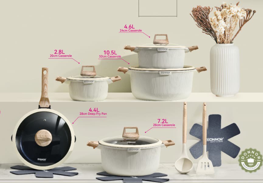 Стеклянная крышка с аккуратной ручкой позволяет следить за процессом готовки, не теряя тепло и влажность. Внешний декор — кремовая эмаль с вертикальной рифлёной текстурой и ручками «под дерево» — придаёт посуде скандинавский минимализм и органично впишется в интерьер современной кухни.