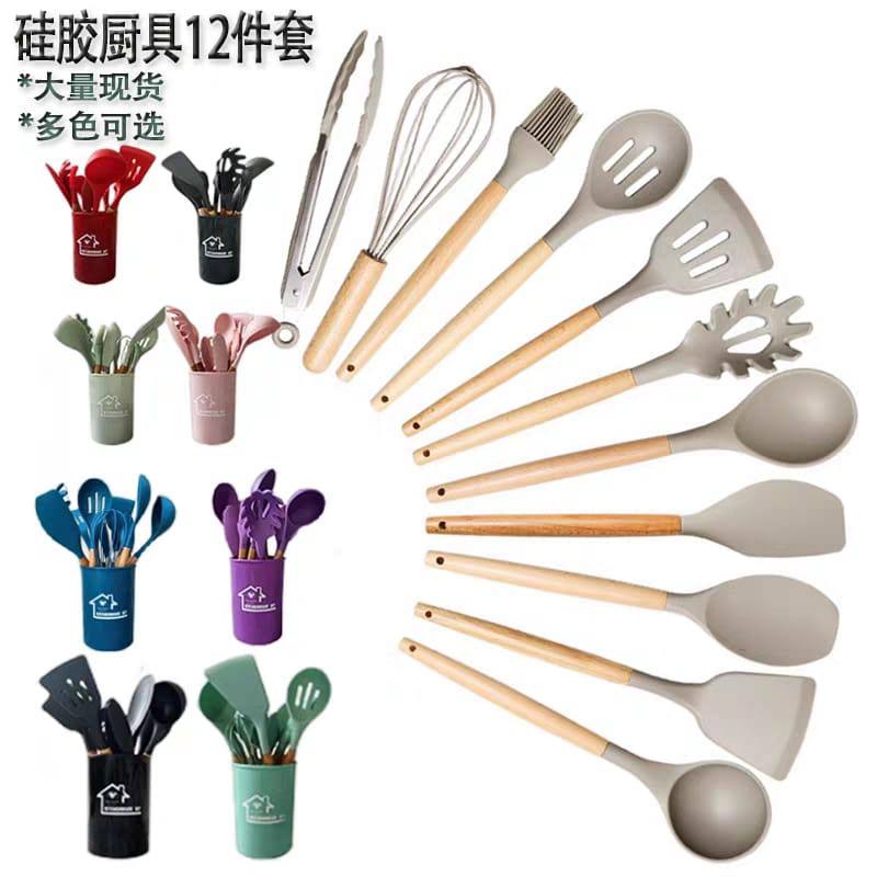 Набор кухонных принадлежностей из 12 предметов с деревянными ручками. Включает основные инструменты для готовки: лопатки (в том числе для пасты), венчик, щипцы, кисточку для масла, ложки и другие аксессуары. Рабочие части выполнены из термостойкого силикона, который не царапает посуду. Комплектуется подставкой для удобного хранения. Подходит для ежедневного использования на кухне.