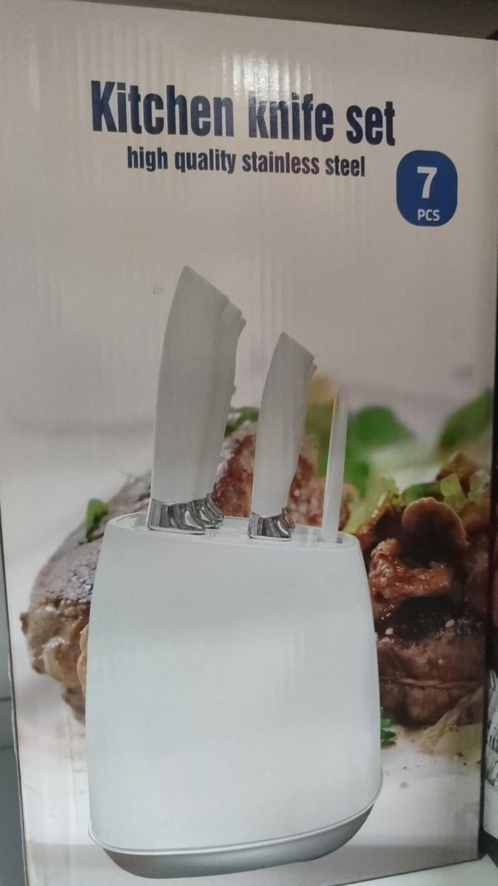 Кухонный набор из семи предметов — воплощение современного минимализма и функциональности, идеально подходящее для любой кухни. В комплекте представлены ножи из высококачественной нержавеющей стали, гарантирующей исключительную остроту и долговечность, а также стильная подставка. Рукоятки ножей выполнены в элегантном белом цвете, дополнены блестящими металлическими вставками у основания лезвия, что придает им изысканный вид и обеспечивает удобный хват.