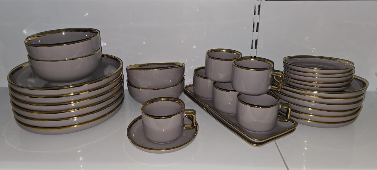 Этот сервиз — сочетание сдержанной роскоши и практичности. Изящный пудрово‑лавандовый фарфор украшен тонкой металлической (золотистой) каймой по краям тарелок, чаш и блюдец, что придаёт набору праздничный, но не вычурный характер. Набор подойдет для ежедневного использования и для особых случаев: семейного обеда, званого ужина или классического чаепития. Благодаря нейтральному оттенку он легко сочетается с другими элементами сервировки и интерьером в скандинавском, современном или романтическом стиле.