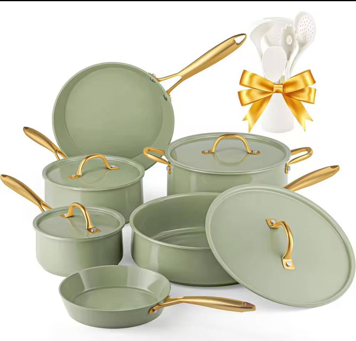 Каждое изделие оснащено высококачественным антипригарным покрытием, которое позволяет готовить с минимальным количеством масла и легко очищается после использования. Особую элегантность дизайну придают утонченные золотистые ручки и плоские крышки, обеспечивающие идеальное прилегание. В качестве бонуса набор укомплектован коллекцией белых кухонных инструментов, которые бережно взаимодействуют с поверхностью посуды.