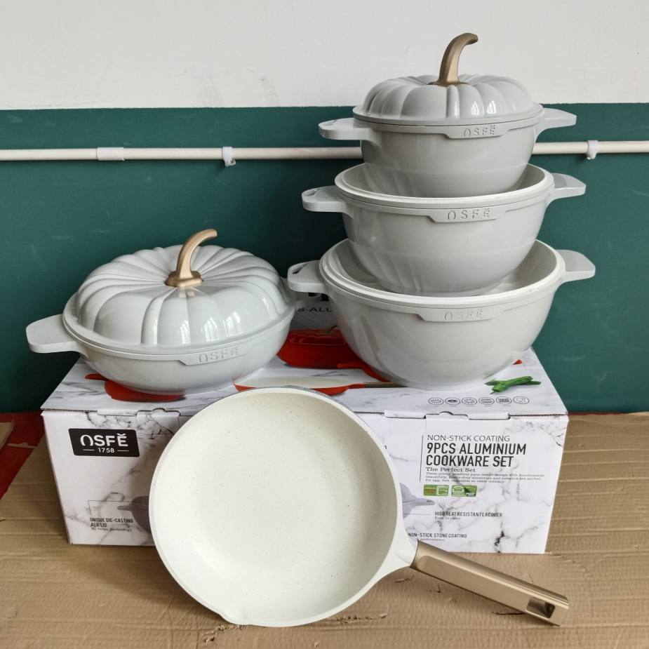 Набор посуды из 9 предметов из литого алюминия. Дизайн выполнен в виде горшочков с крышками в форме тыкв, что придаёт набору оригинальный внешний вид. В комплект входит также сковорода. Посуда подходит для всех типов плит, включая индукционные. Практичный и стильный выбор для приготовления различных блюд.