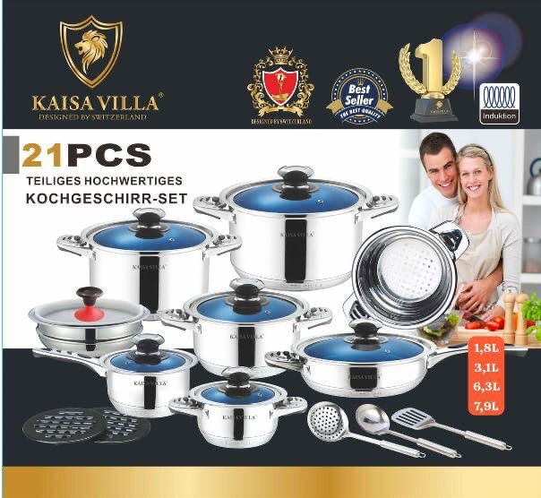 Набор посуды KAISA VILLA из 21 предмета — это универсальный комплект из нержавеющей стали с крышками из стекла, который прекрасно подходит для современной кухни. В комплект входят четыре вместительные кастрюли объемом 1,8 л, 3,1 л, 6,3 л и 7,9 л, сковорода с крышкой, а также кухонные аксессуары: шумовка, ложка, лопатка и подставки.