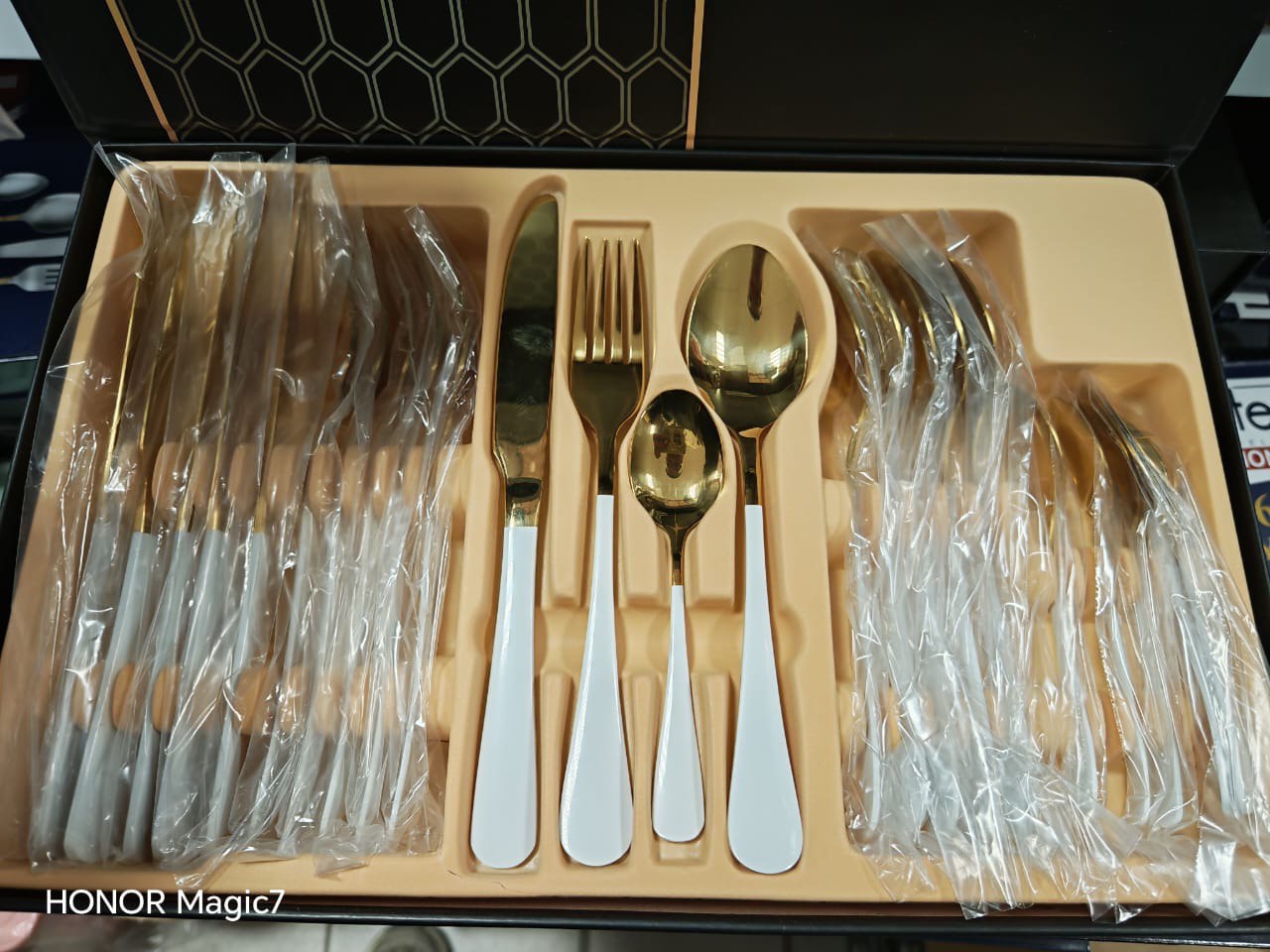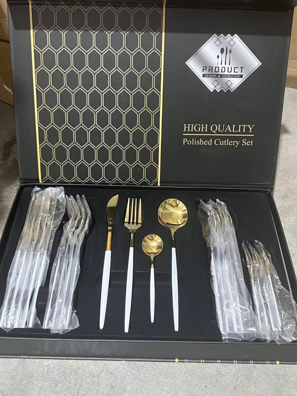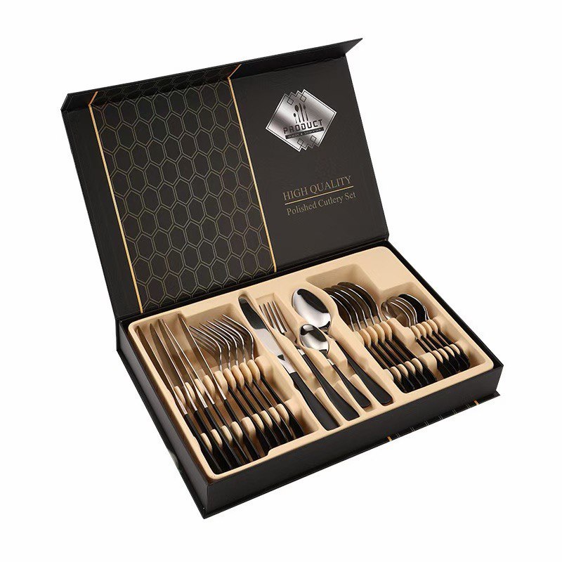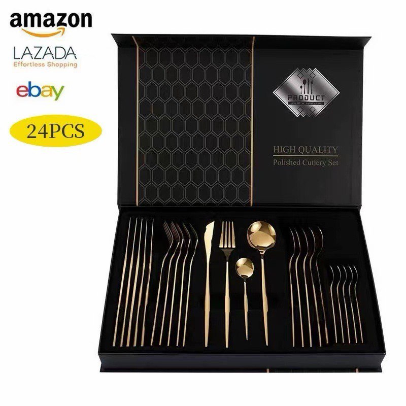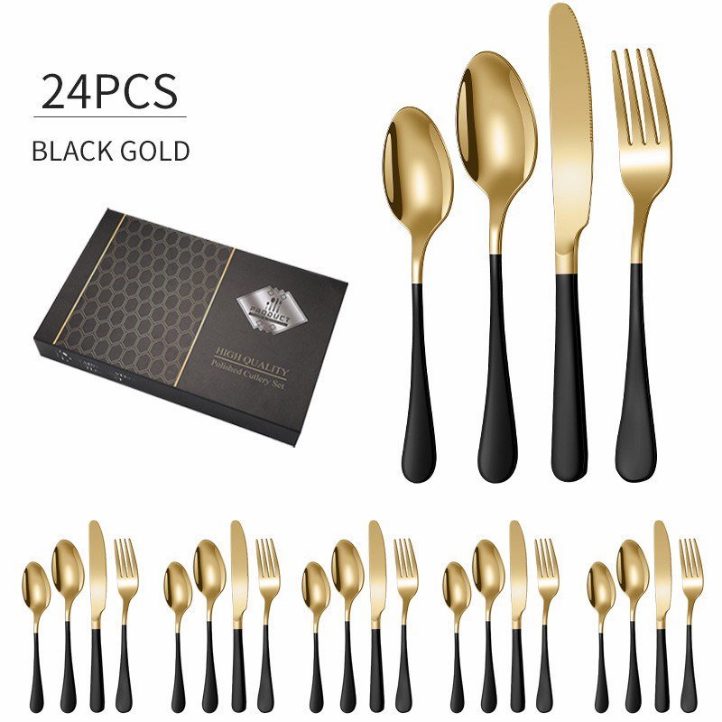 Изысканный набор столовых приборов на 24 предмета — истинное воплощение современной роскоши и минимализма. Изготовленный из высококачественной полированной нержавеющей стали, он сочетает в себе долговечность и безупречный стиль. Дизайн набора построен на эффектном контрасте матовых рукоятей и зеркально-золотых рабочих поверхностей, что придает сервировке стола аристократичный и торжественный вид.