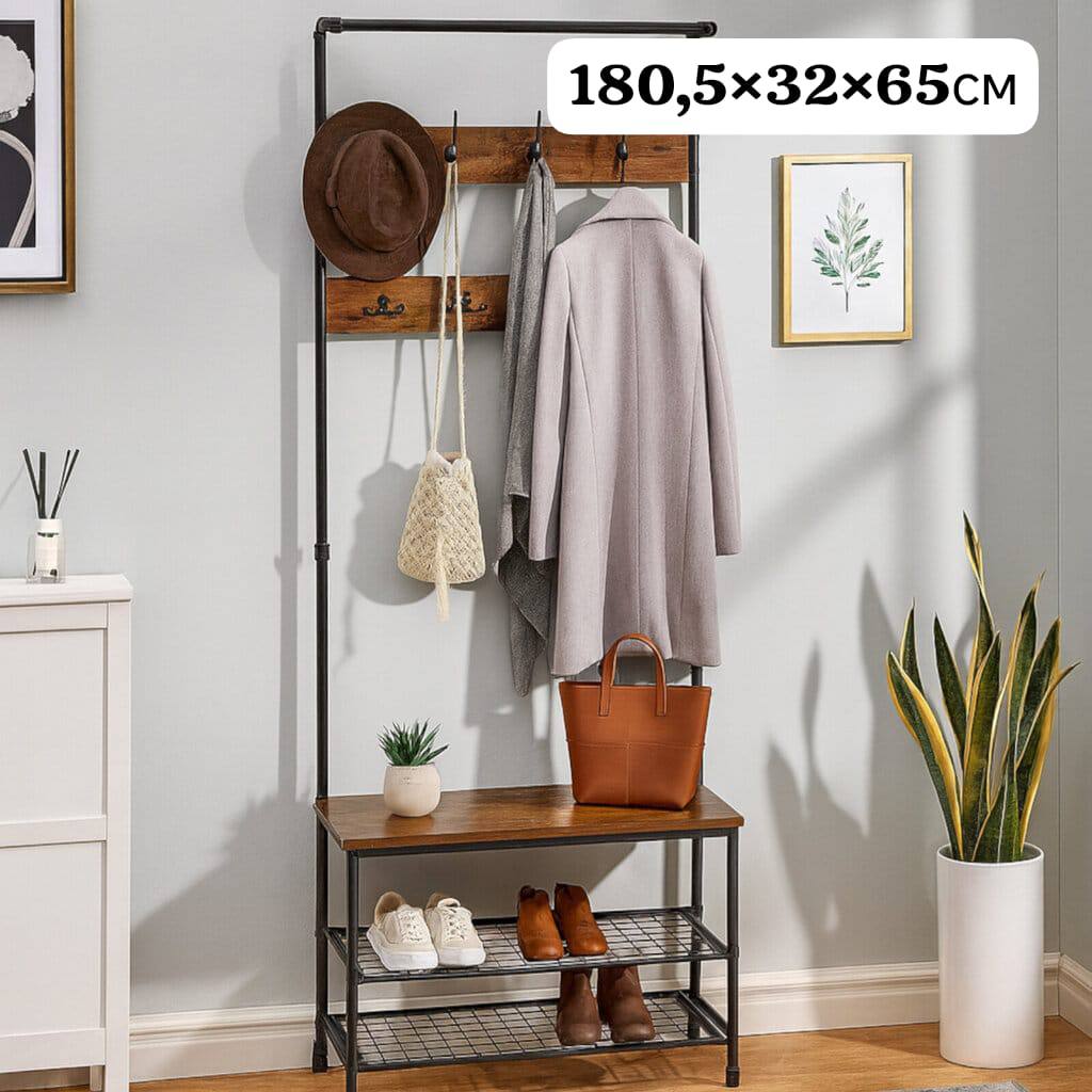 Практичная вешалка сочетает в себе сразу несколько функций: место для верхней одежды, обувницу и скамейку. Идеально впишется в интерьер прихожей благодаря лаконичному дизайну в стиле лофт.